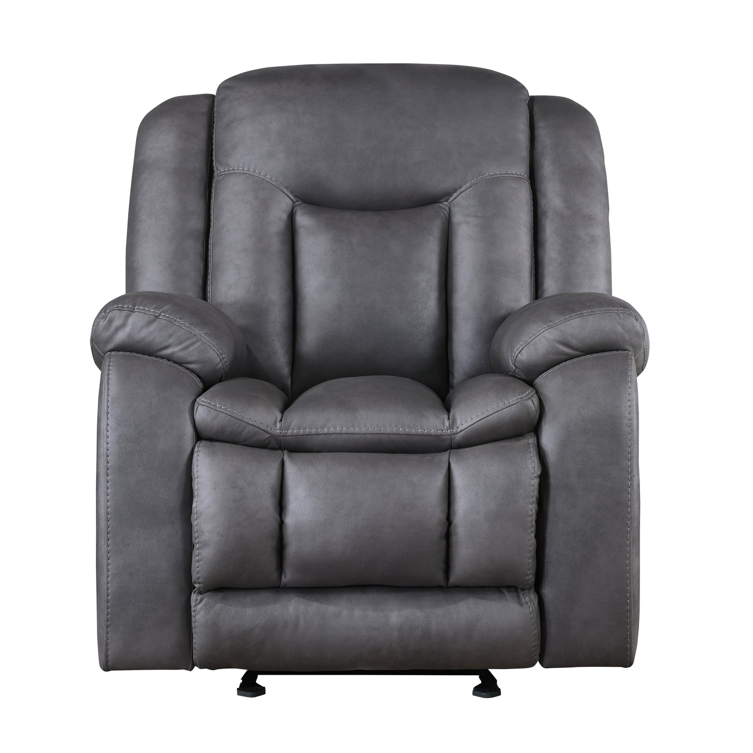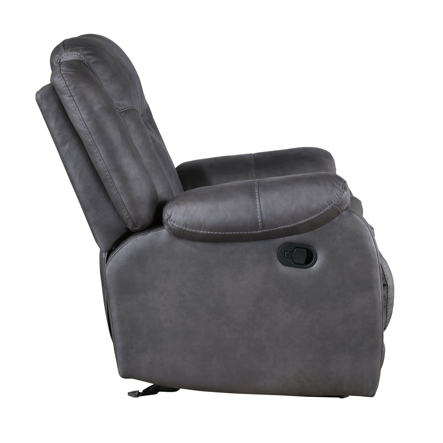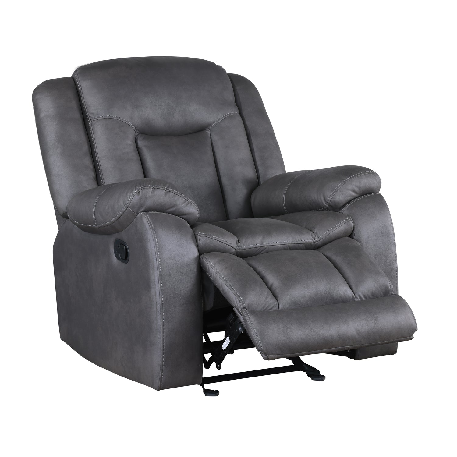 The Morello Glider Recliner in gray is designed to bring comfort and style to your living space. Upholstered in sumptuously soft 100% polyester fabric in a gray color, this recliner mimics the look of leather without the higher price tag. The Morello Glider Recliner features double-stitch detailing for added durability and a touch of sophistication. Plush, overstuffed arm, seat, and back cushions are contoured for enhanced comfort, ensuring a cozy seating experience. Enjoy the recliner's smooth gliding action that rocks you into relaxation, and take advantage of the fully upholstered chaise recliner footrest for ultimate comfort. Built with hardwood and manufactured wood frames, coil spring cushions wrapped in resilient foam and polyester, and no-sag seat suspension, this glider recliner promises years of enjoyment. The casual, transitional style, with its leather-look upholstery and overstuffed cushioning, creates a comfortable, lived-in ambiance, making the Morello Glider Recliner a perfect addition to any home.