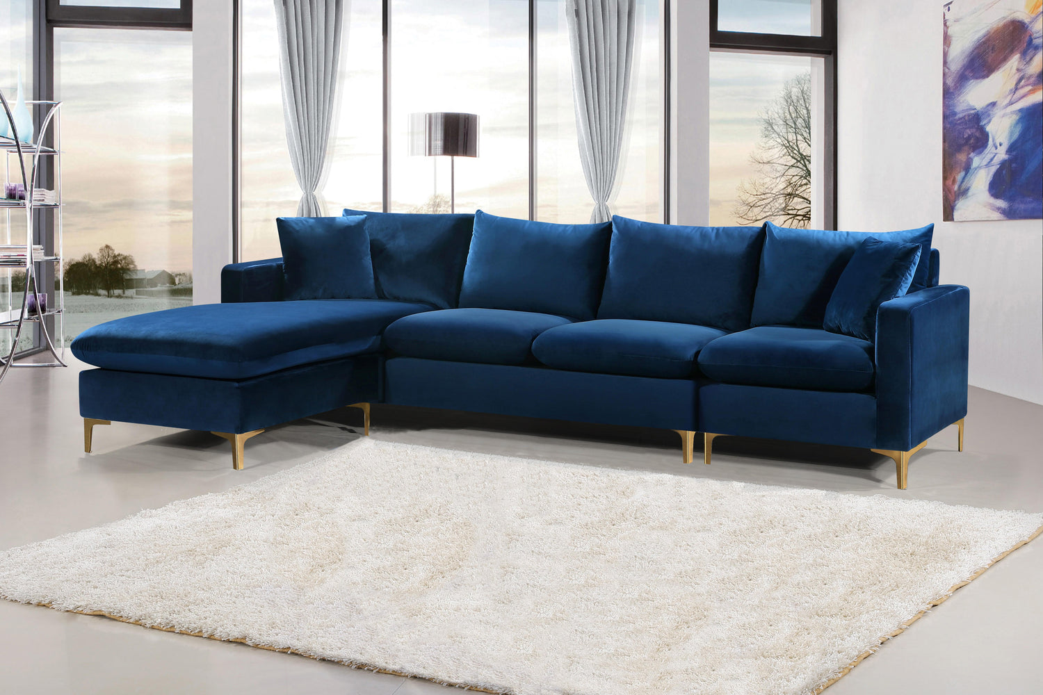 Bring glamour to your living room or den with this Naomi Navy Velvet Sectional. This striking set blends the modern with the traditional for a look that wows from every angle. Luscious velvet provides a neutral element to your room, ensuring its easy fit with existing furnishings. Choose from either set of legs, both gold and chrome, to customize the sectional to your specific tastes. Pillows come with this sectional, adding to its welcoming feel.