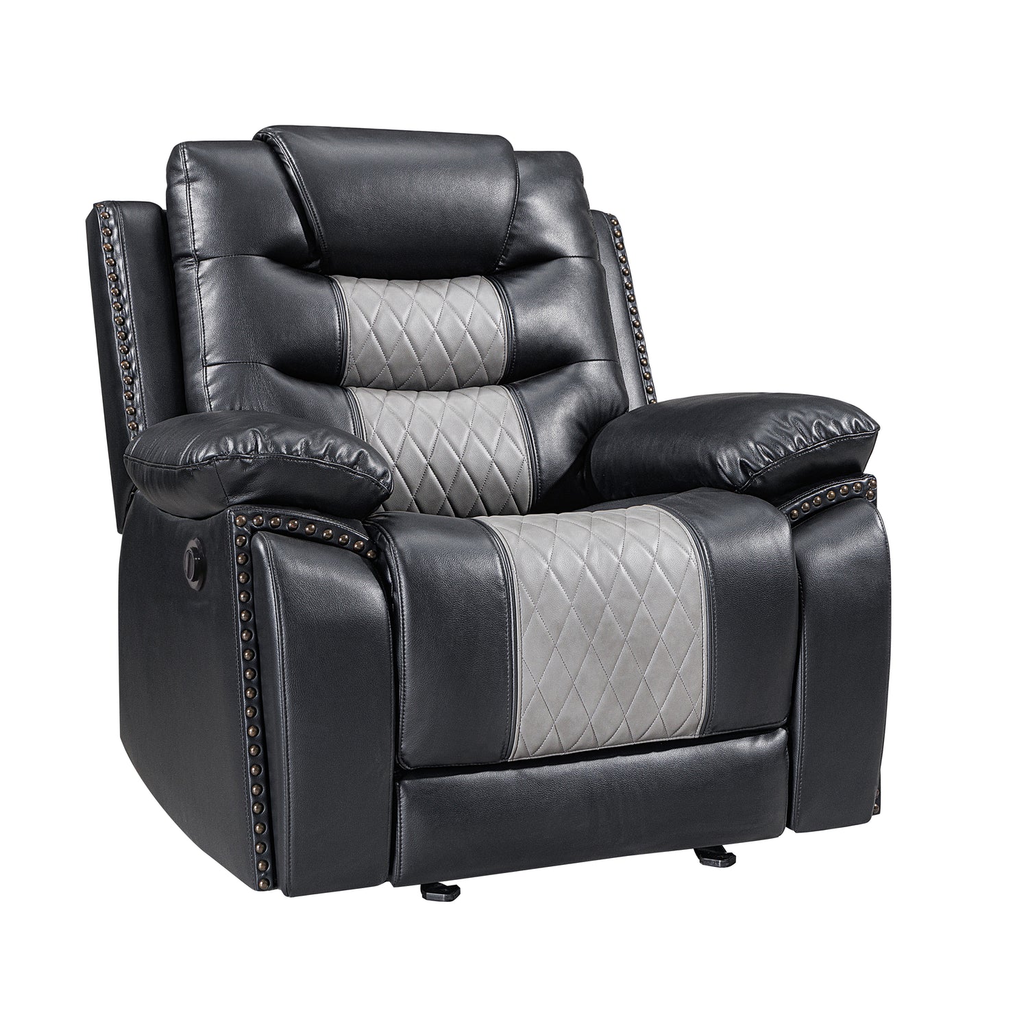Experience the ultimate in comfort with the Nikko Glider Recliner with Power Footrest and Hidden Cup Holders . Crafted with long-lasting construction, the frames are made from hardwoods and plywood, ensuring a stable and durable seating experience. Enjoy luxurious comfort with resilient foam cushions and pocket coil support, providing a cozy place to lounge. The two-tone black and gray fabric, made from 80% polyester and 20% PU, offers the soft touch and look of leather with added breathability. Distinctive details such as nailhead trim, diamond stitch pattern seats, double wrapped headrests, and expert tailoring make this recliner a standout piece in any home. The glider recliner includes hidden cupholders in discreet pullout compartments under the armrests and a USB charging port to keep your devices powered up. With soothing, gentle gliding action, plush pillowed arm and headrests, reclining backs, and comfortable footrests, this recliner provides the perfect place to unwind. Find your perfect recline position with the touch of a power button. Enjoy unparalleled comfort and style in your home with the Nikko Recliner.