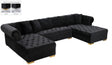Get ready to relax after a long day with this Presley Black Velvet 3pc. Sectional from Meridian Furniture. Featuring rich black velvet upholstery with deep tufting and comfy pillows, this double chaise sectional provides a luxurious, cozy space to kick back and watch TV, take a nap, or curl up with a nice book. Complete sets of gold and chrome legs complement your contemporary home decor while providing solid support for the sectional's frame.