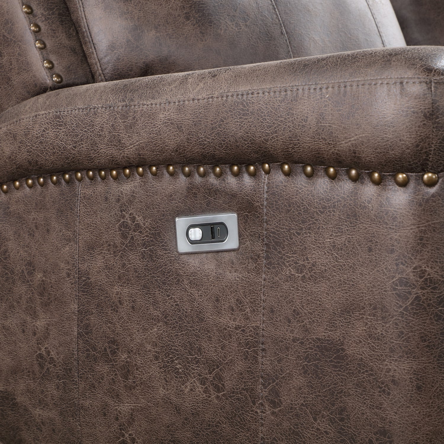 The Quade Power Dual Reclining Console Loveseat in mocha brown combines durability, comfort, and modern convenience. Built on a sturdy frame of premium hardwood, plywood, and engineered wood, this loveseat is designed to provide long-lasting support. The bucket seats feature high-performance coil springs and plush foam, offering both softness and support by evenly distributing weight, preventing sagging, and maintaining shape over time. The 100% polyester fabric, with its rich, mottled brown finish, mimics the luxurious look of leather while delivering breathability and a soft, inviting touch. Effortlessly recline at the touch of a button with the smooth power motion mechanisms, ensuring a deeply relaxing experience. This loveseat’s classic nailhead trim and tailored backrests offer a balanced blend of modern and traditional design elements, creating a versatile, timeless style. The console includes a built-in storage compartment, integrated cupholders, and USB chargers, making it easy to keep essentials organized and devices powered while you unwind in comfort.
