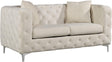 Sink into the welcoming comfort of this Scarlett cream velvet loveseat. This loveseat defines elegance and sophistication with its boxy retro look and its deeply tufted upholstery that covers every inch of the sides, back, and front. The cream velvet material feels luxurious to the touch while the chromed legs lend the loveseat sturdy support and a modish finish. Pair it with other items in the Scarlett collection for a complete look.