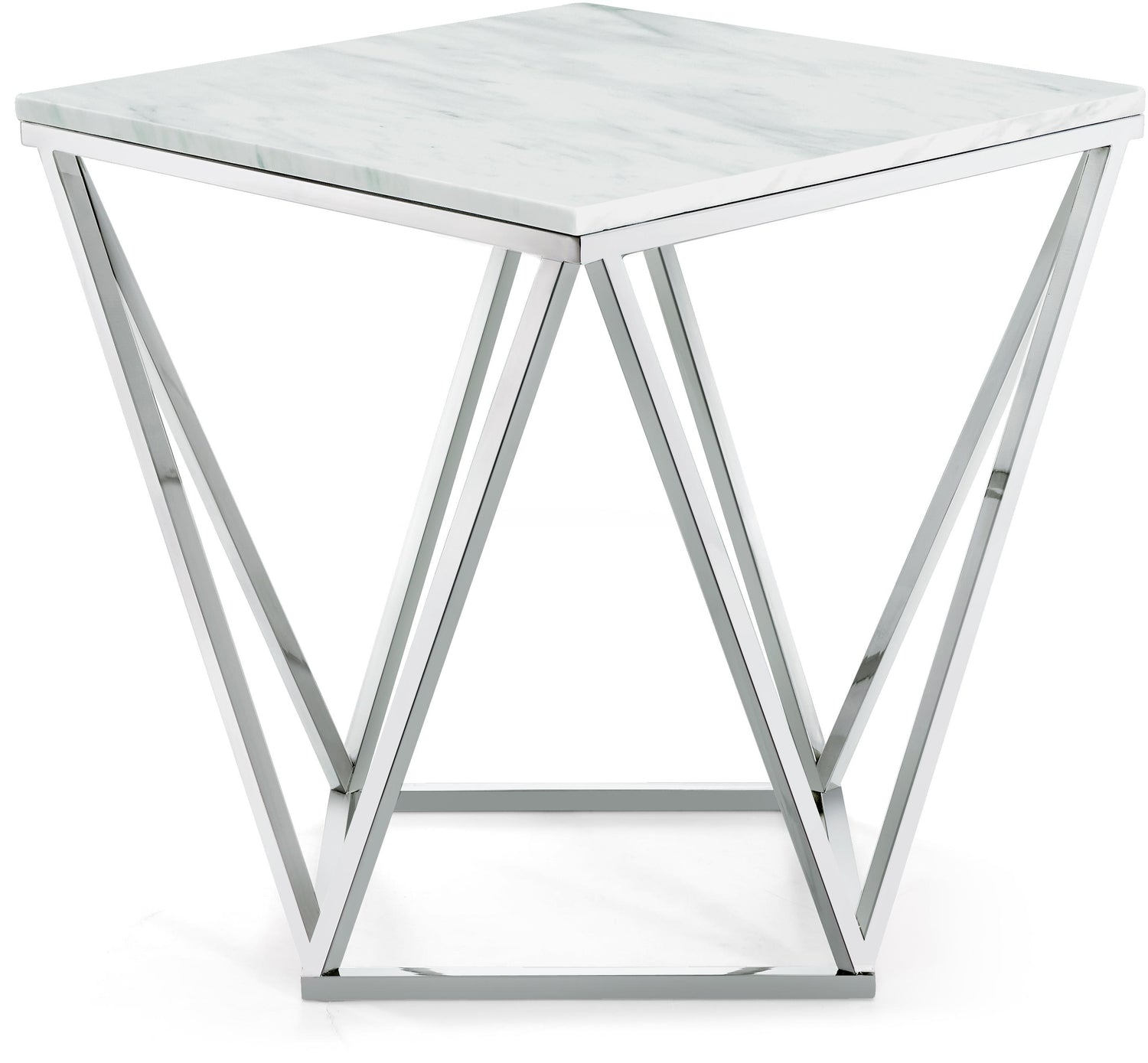 Keep the modern vibe going with this Skyler stainless steel end table from Meridian Furniture. This end table features architectural bases with a sculptural design that's chic and contemporary. The tops of each table feature solid stone tops for durability and remarkable style.
