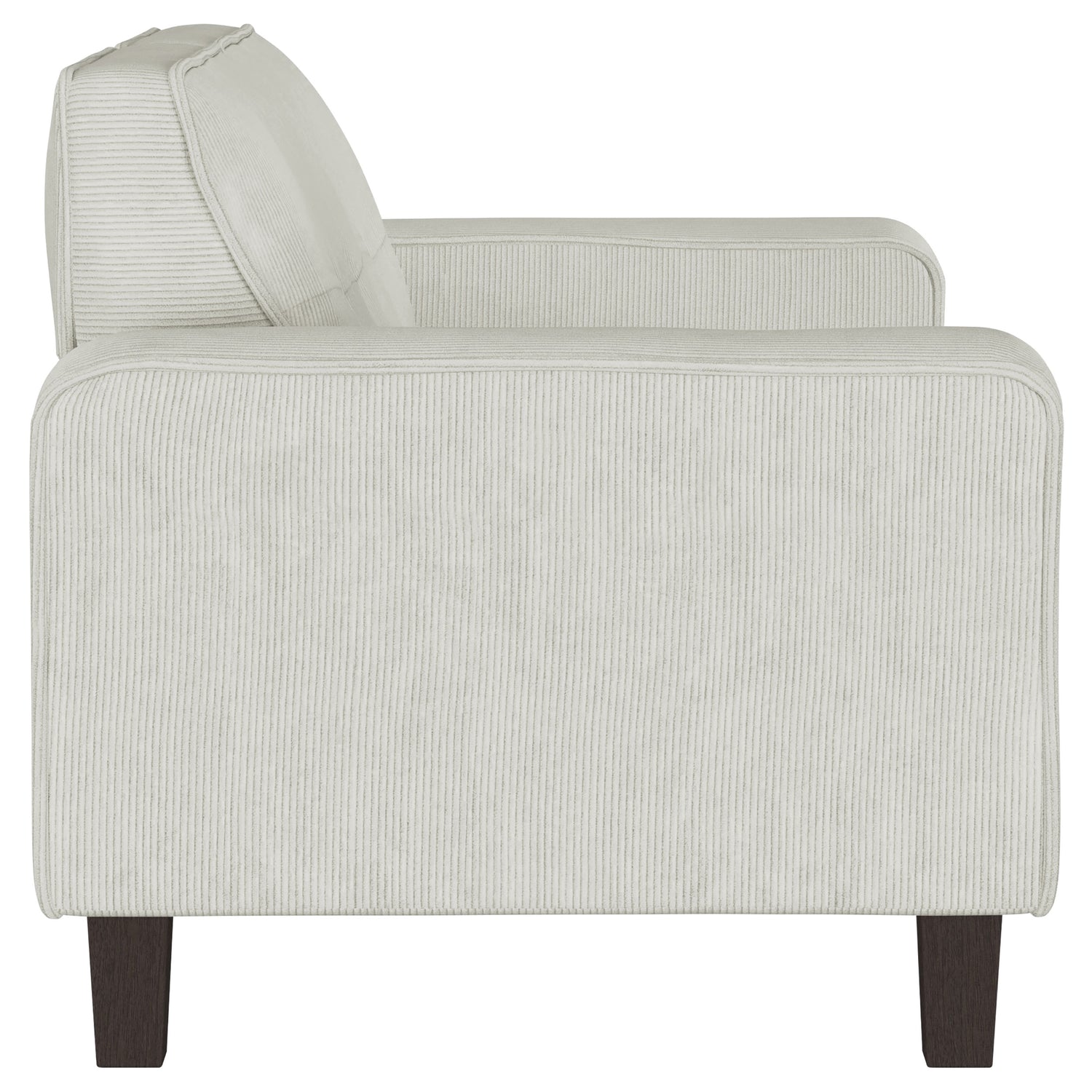 Inject impressive comfort and impeccable style with a modern loveseat in your living room or den. Its tufted back cushions add depth and dimension, perfect for a touch of character in your living area. Plush, soft upholstery in a neutral hue complements perfectly, offering inviting comfort and style with corduroy-like texture. Wide track arms add structure to a clean-lined silhouette, offering timeless flair that blends in any setting. Tapering wooden legs complete the look, offering height that create a touch of light, airy ambiance that delivers a modern design.