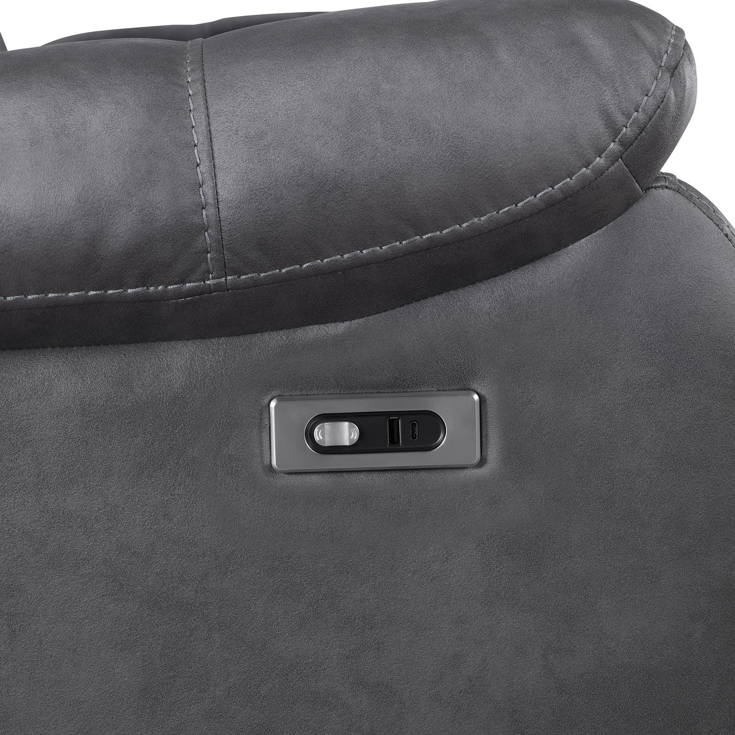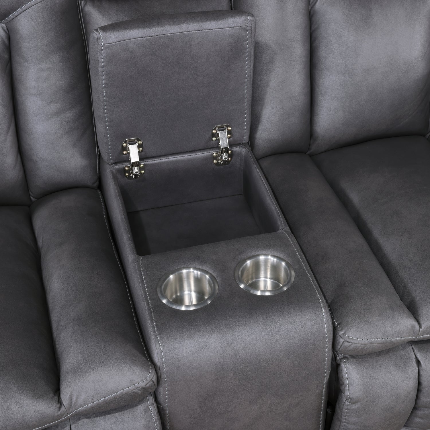 The Morello Power Recliner Console Loveseat in gray is an ideal choice for enhancing your living space with both style and comfort. This power console loveseat is upholstered in sumptuously soft 100% polyester fabric in a gray color, mimicking the luxurious look of leather without the higher price tag. The Morello Set features double-stitch detailing for added durability and a sophisticated touch. Plush, overstuffed arm, seat, and back cushions are contoured to provide enhanced comfort, making relaxation effortless. Fully upholstered chaise recliner footrests allow you to find your most restful position with the touch of a button. Built with hardwood and manufactured wood frames, coil spring cushions wrapped in resilient foam and polyester, and no-sag seat suspension, this loveseat promises years of enjoyment. The casual, transitional style, with its leather-look upholstery and overstuffed cushioning, creates a comfortable, lived-in ambiance. Convenient features include a center console for storing remote controls and built-in cupholders for beverages, while USB-C ports allow you to conveniently charge your devices. The Morello Power Recliner Console Loveseat combines practicality and luxury, making it a smart addition to any home.
