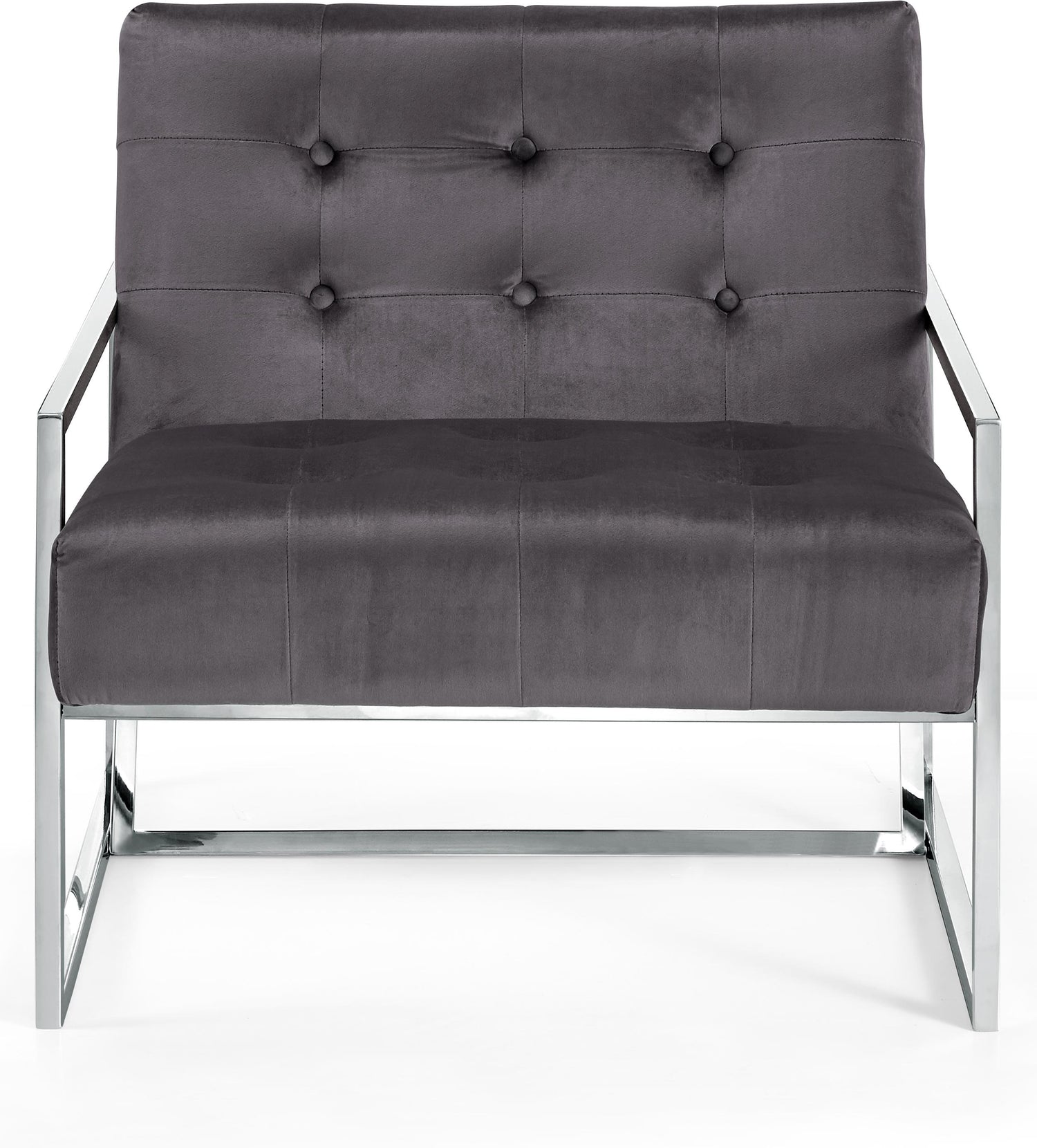 Cozy up to the welcoming comfort of this beautiful Alexis grey velvet accent chair. A stainless steel base and frame makes this retro-themed chair a durable and lasting addition to your living room or elsewhere. The sleek velvet upholstery feels great to the touch, while thick seat and back cushions cradle your body in comfort. Both cushions are tufted, helping them keep their fill longer and extending the chair's useful service life.