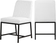 Give your dining room a revamp with this Bryce Faux Leather Dining Chair from Meridian Furniture. This handsome chair features an armless design with heavily padded seat and back cushions, ensuring that guests stay comfortable all the way through dessert. The back is quilted for added aesthetic appeal, and it's upholstered in white faux leather for the luxury look of leather without the maintenance requirements. A metal frame and matte black metal legs complete the look and provide sturdy support.