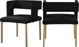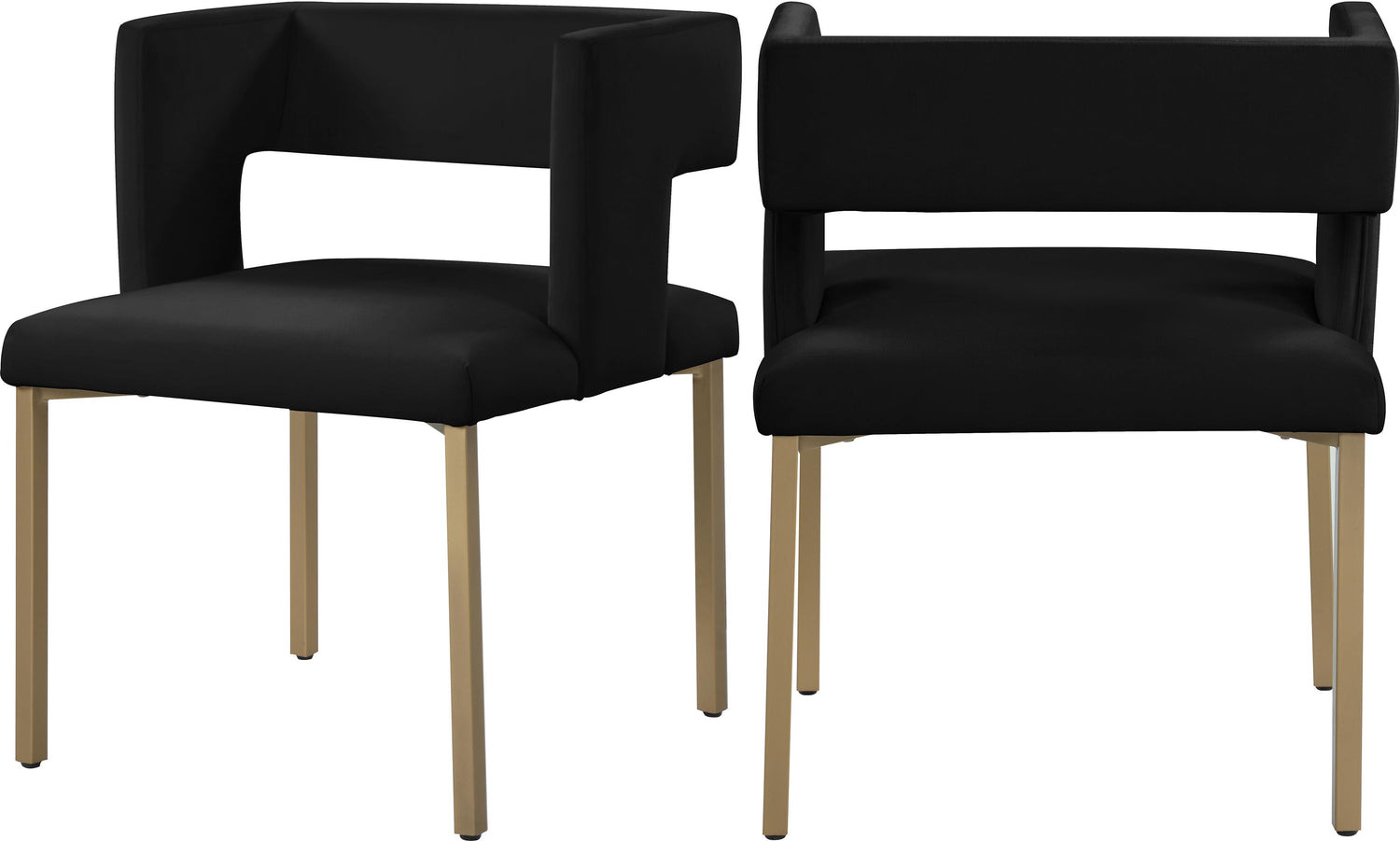 Add the Caleb black velvet dining chair to your dining room for the ultimate in comfort and style. This chair has a square seat and low back which is open at the bottom to the rear and on the sides. Four brushed gold square iron legs provide support and stability, while the chair's soft velvet and cushioning offer an air of luxury. Several available tables make a perfect companion to this contemporary piece.