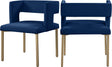 Add the Caleb navy velvet dining chair to your dining room for the ultimate in comfort and style. This chair has a square seat and low back which is open at the bottom to the rear and on the sides. Four brushed gold square iron legs provide support and stability, while the chair's soft velvet and cushioning offer an air of luxury. Several available tables make a perfect companion to this contemporary piece.