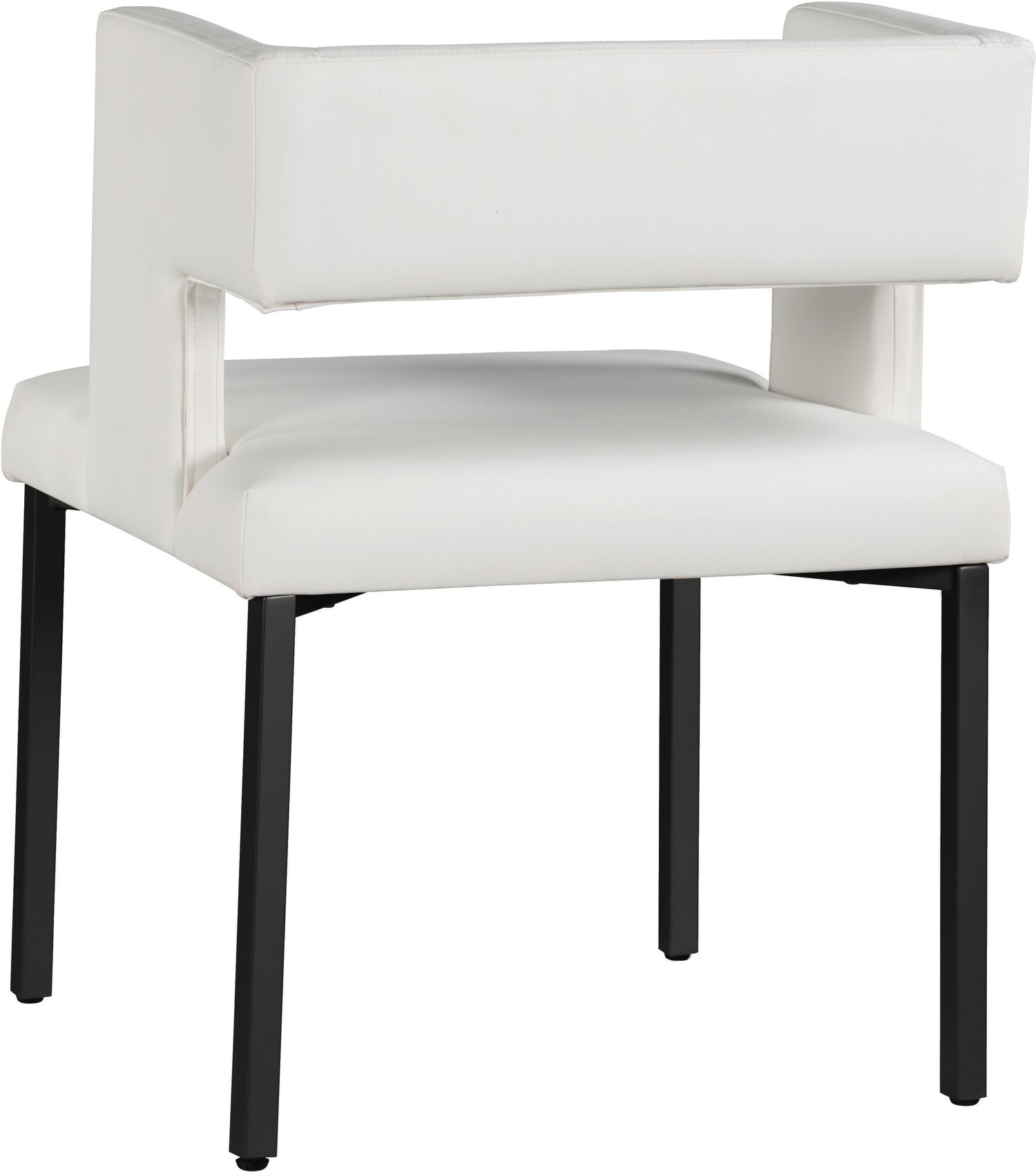 Add the Caleb white faux leather dining chair to your dining room for the ultimate in comfort and style. This chair has a square seat and low back which is open at the bottom to the rear and on the sides. Four brushed gold square iron legs provide support and stability, while the chair's soft velvet and cushioning offer an air of luxury. Several available tables make a perfect companion to this contemporary piece.