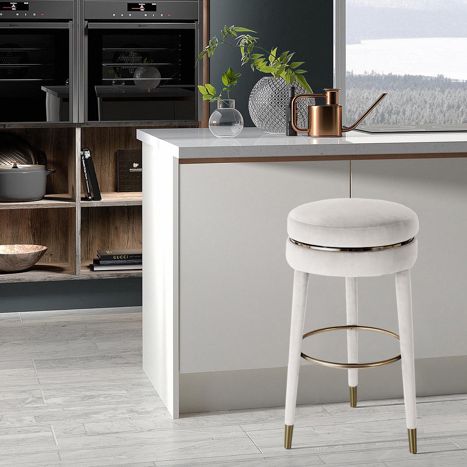 This counter-height Coral velvet stool is nothing short of stunning. The clean lines and elegant design make it a winner, whether you use it at the home bar or the breakfast counter. The soft cream velvet upholstery is sleek and comfortable to the skin, and the wood frame adds durability and strength to the stool. A metal foot ring and accents complete this contemporary stool design.