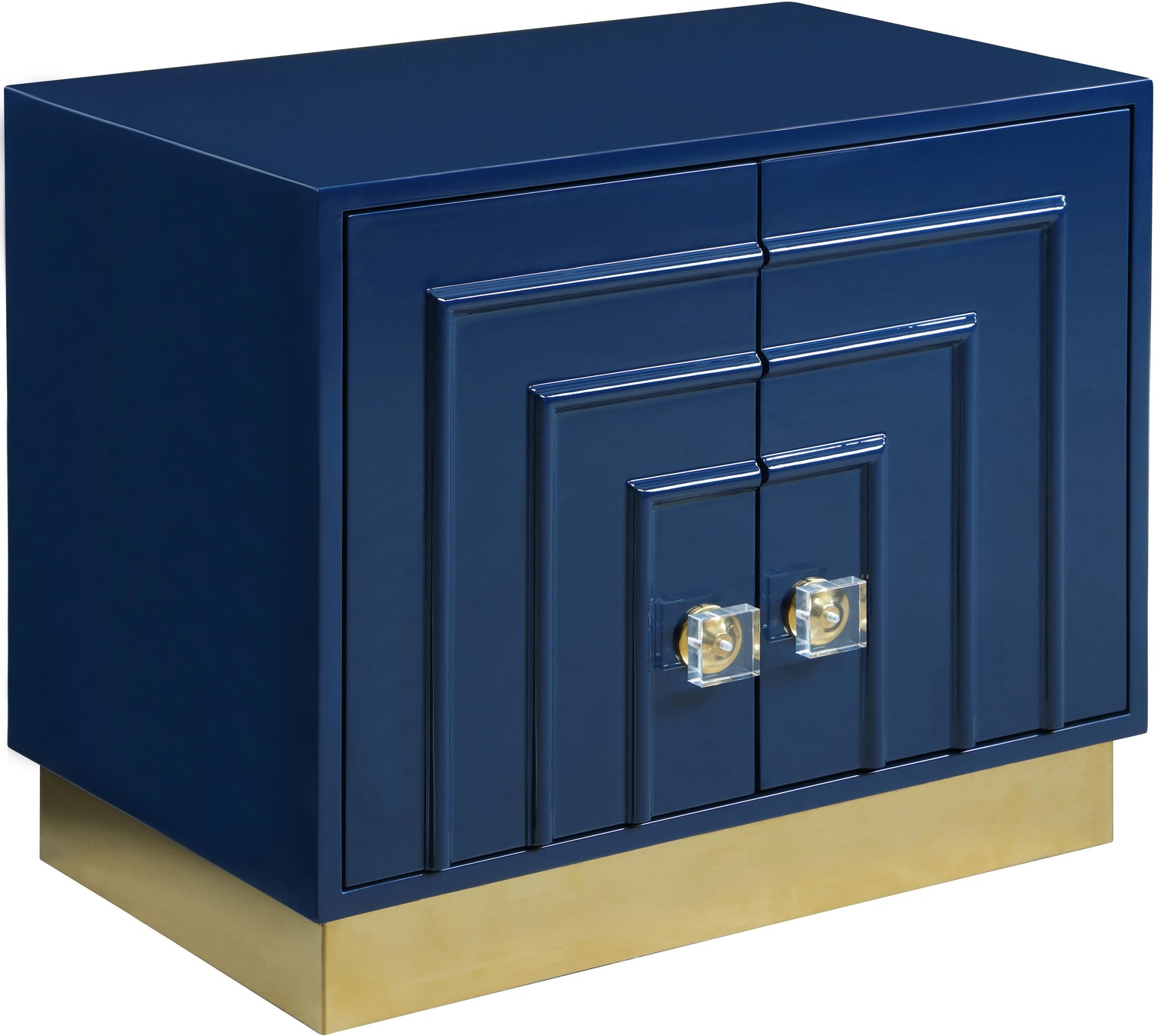 House everything you need in your room out of sight with the help of this Cosmopolitan side table, a perfect addition to a bedroom or living room space. This elegant and eye-grabbing unit features a stunning navy lacquer finish along with a gold stainless steel base and acrylic and gold handles. The overall result is a table that���s both chic and sophisticated���and that meshes well with other contemporary accents in your room.