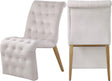 Usher in a new era in your dining room with this Curve velvet dining chair to impress your guests. This chair features an elongated front that sweeps the floor for a look that���s luxe to the max. Soft cream velvet feels sleek and rich to the touch, giving it a refined and elegant feel. Its rich gold iron legs and detailed button tufting ensure that this chair takes on a decidedly modern vibe.
