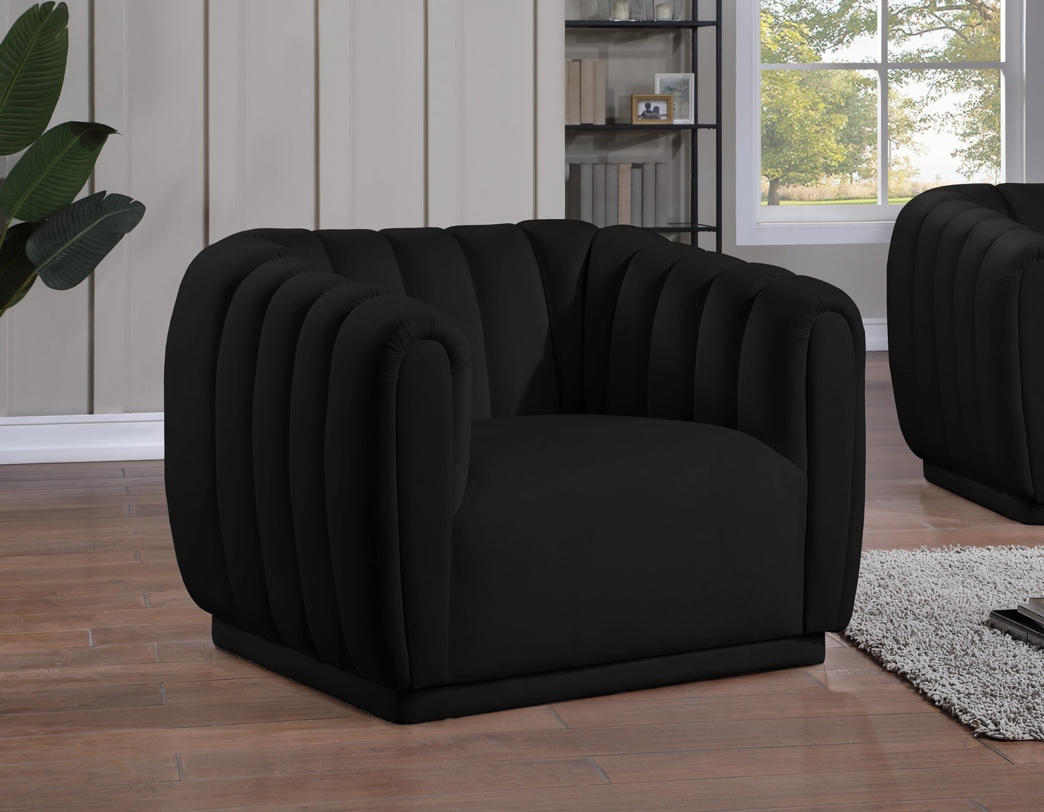 Casual meets elegant in the design of this Dixie velvet chair. Relax, unwind, and take a load off whileyou'rere kicked back in this handsome seating option. Deep channel tufting adds an upscale touch to the unit���s soft black velvet upholstery while giving it a dimensional look. Pair this piece with other items in the Dixie collection for a complete and seamless look in the living room or den.
