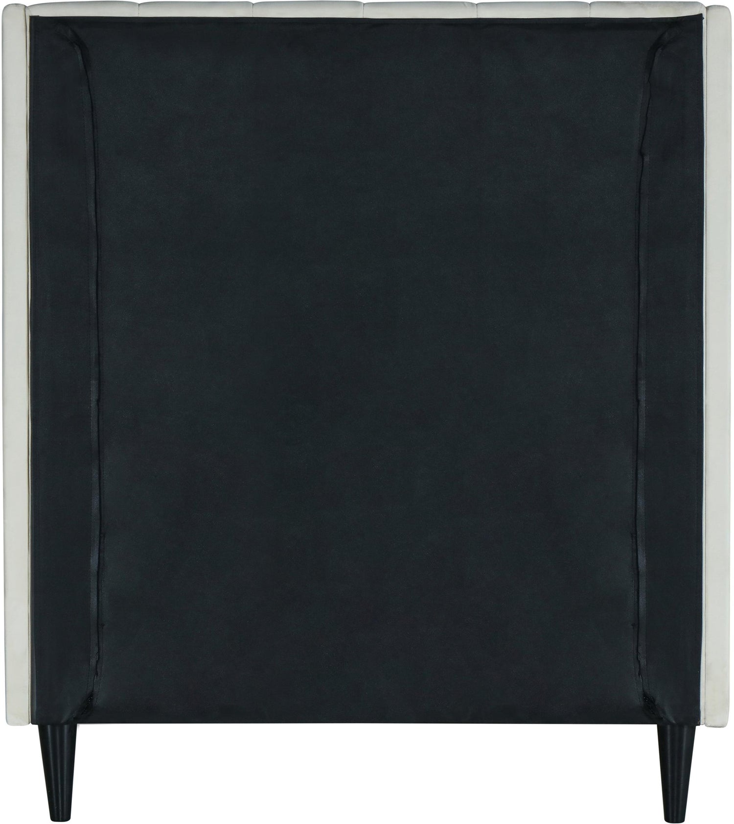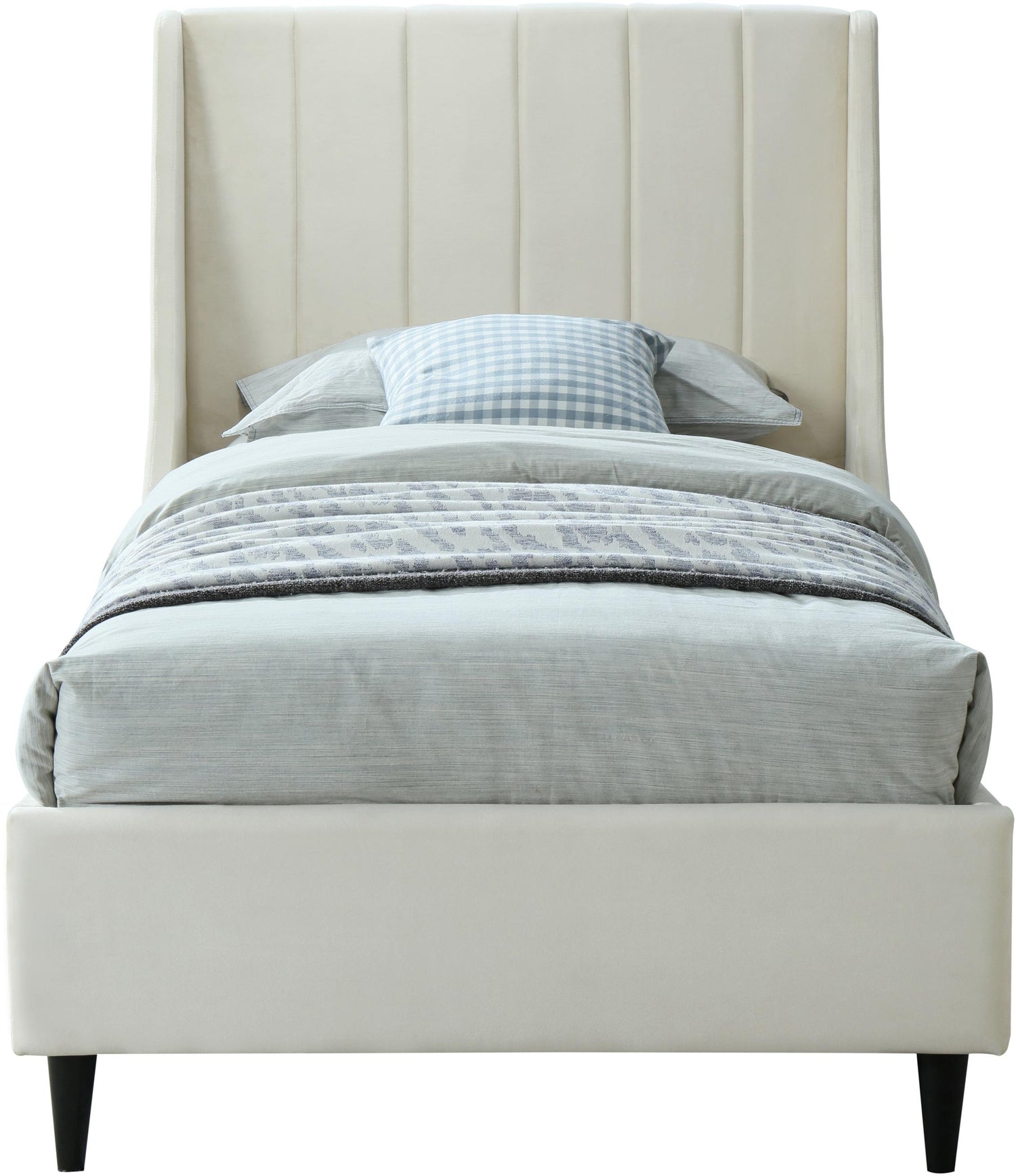 Snuggle up to a pet or other loved one in this richly upholstered Eva cream velvet twin size bed for the ultimate in rest and relaxation. The wing back headboard has cushioned vertical deep channel tufting, and both the side rails and footboard are upholstered too for your comfort. Tapered black wood legs match the upholstery and support this contemporary bed, elevating it sufficiently that you can store items underneath.