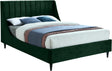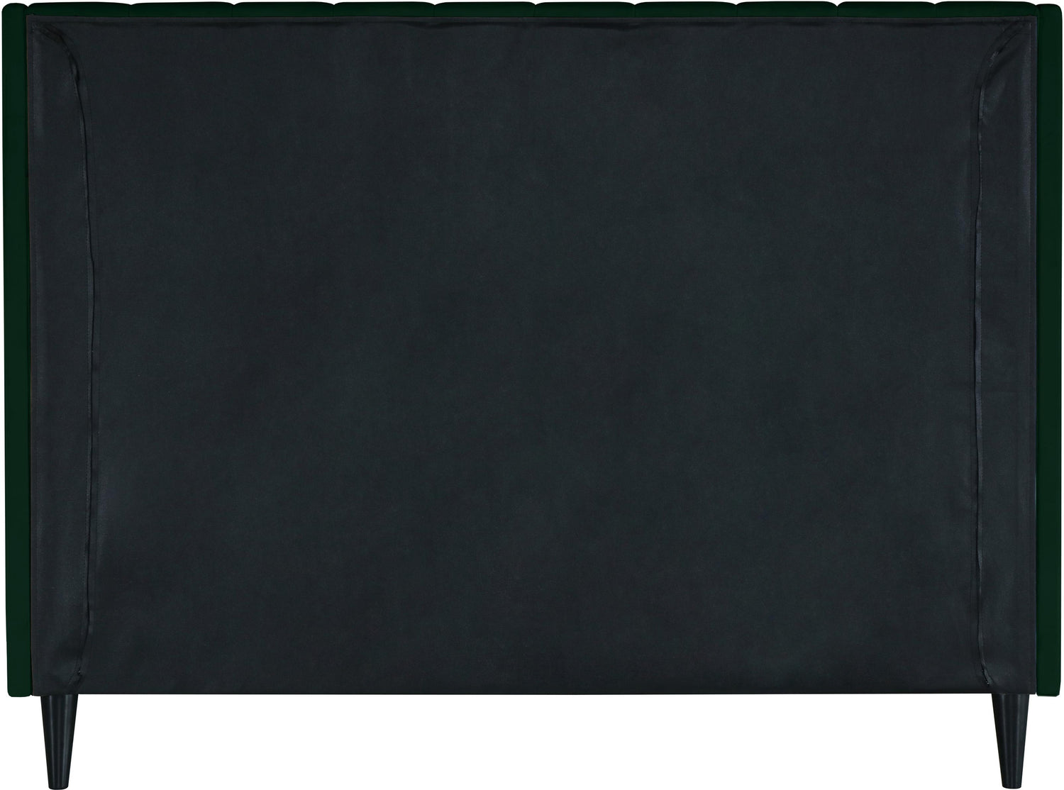 Snuggle up to a pet or other loved one in this richly upholstered Eva green velvet queen size bed for the ultimate in rest and relaxation. The wing back headboard has cushioned vertical deep channel tufting, and both the side rails and footboard are upholstered too for your comfort. Tapered black wood legs match the upholstery and support this contemporary bed, elevating it sufficiently that you can store items underneath.