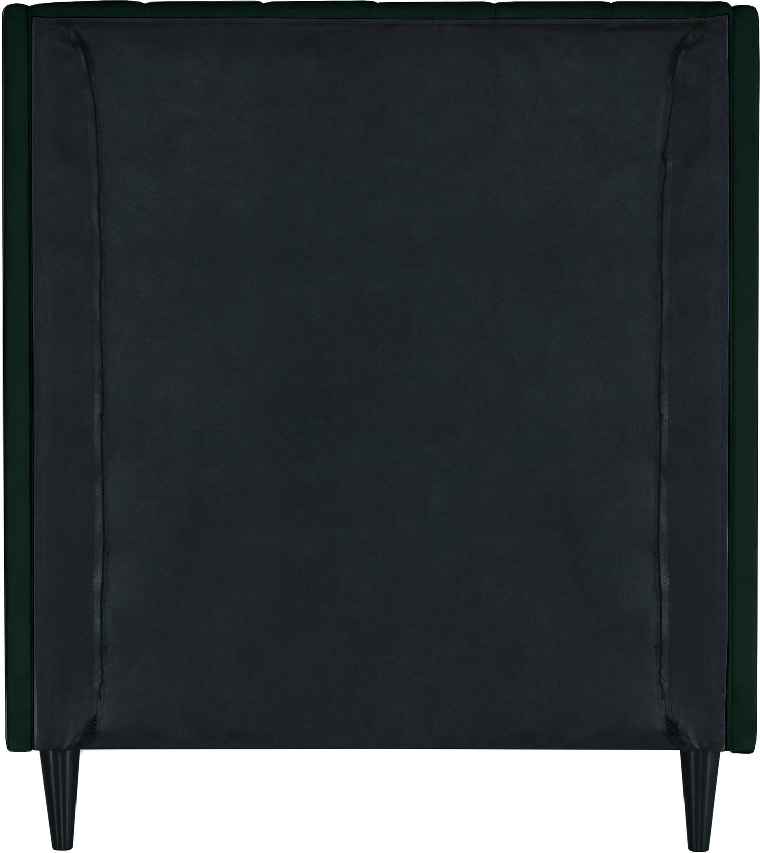 Snuggle up to a pet or other loved one in this richly upholstered Eva green velvet twin size bed for the ultimate in rest and relaxation. The wing back headboard has cushioned vertical deep channel tufting, and both the side rails and footboard are upholstered too for your comfort. Tapered black wood legs match the upholstery and support this contemporary bed, elevating it sufficiently that you can store items underneath.