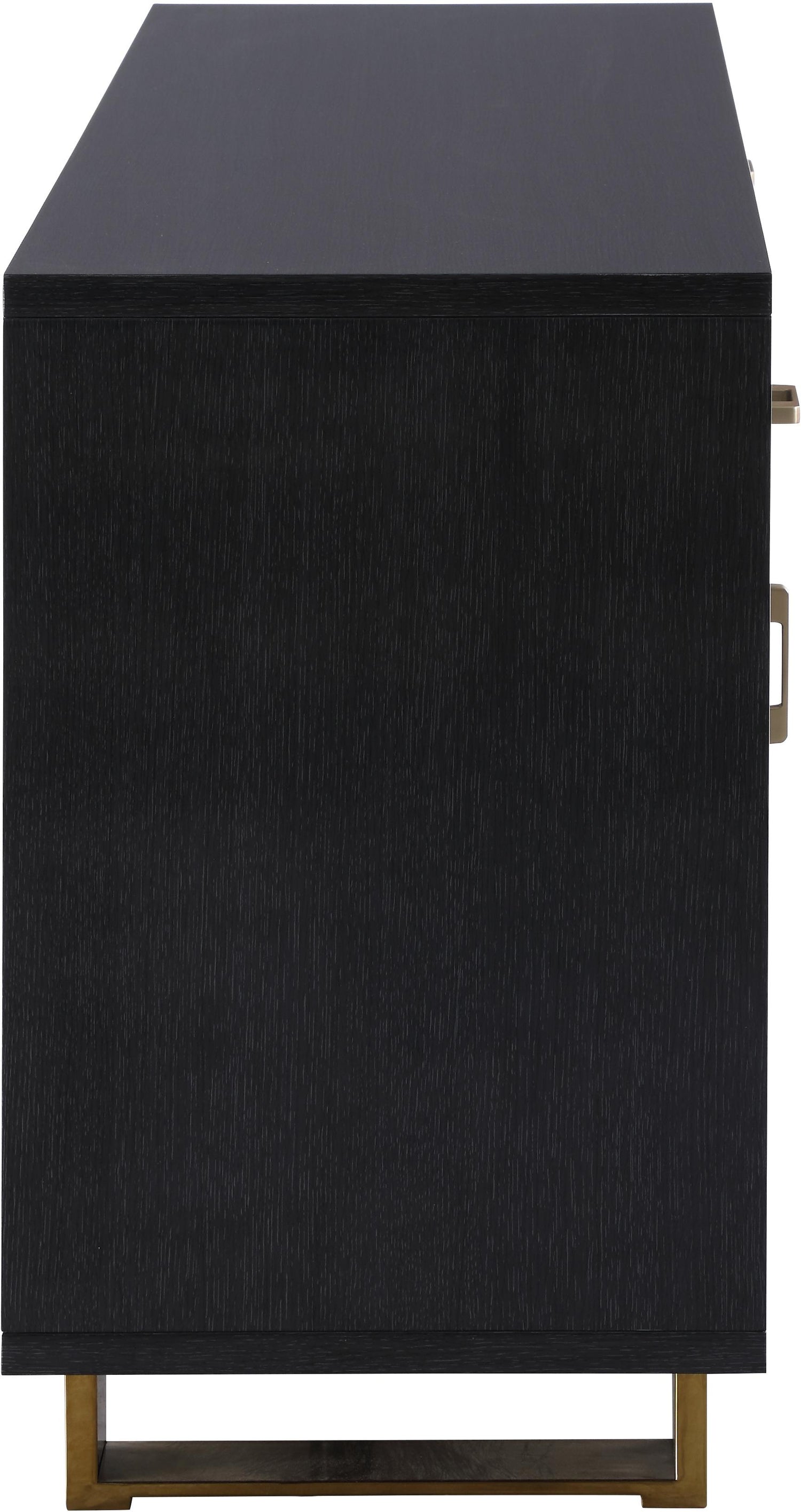 Organize flatware and silverware in the three spacious drawers of this Excel sideboard buffet. This beefy sideboard offers room aplenty for holding things you need in the dining room���out of sight and out of mind. The rich grey oak veneer lacquer finish with gold base and handles gives this unit the modern panache needed to mesh with nearly any contemporary dining set. Wood and stainless steel construction ensures lasting beauty and long-lived performance.