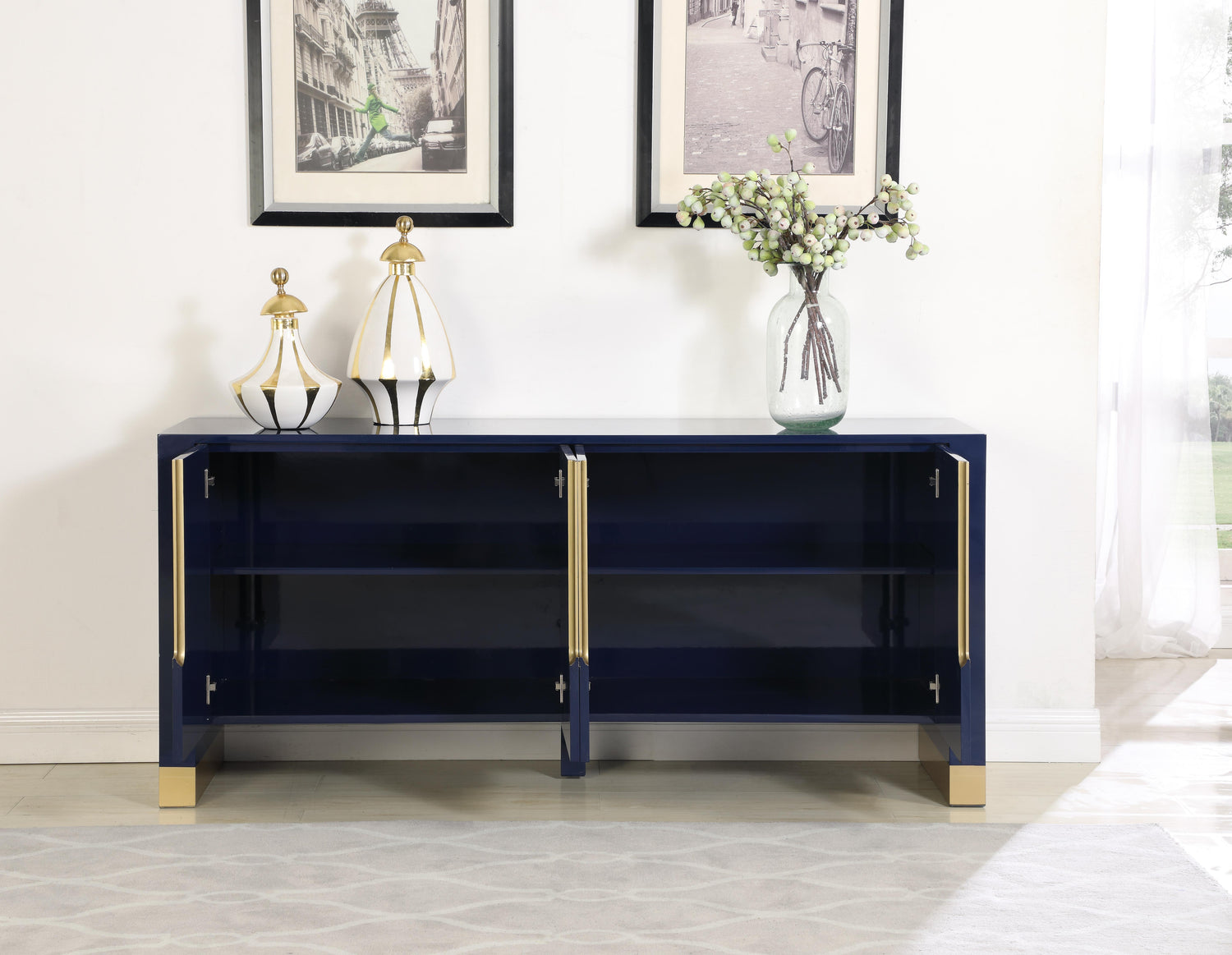 Make a bold statement in your living space with this eye-catching Florence Sideboard/Buffet from Meridian Furniture. Its deep navy blue lacquer is complemented by a gold finished base, creating a contemporary design that's both modern and stylish. Four side cabinet doors open up to reveal four cubby spaces, giving you ample room to safely tuck away dishes, pots and pans, knick-knacks, books, or other household items, while the top of the sideboard/buffet doubles as shelf space for items you want on display.