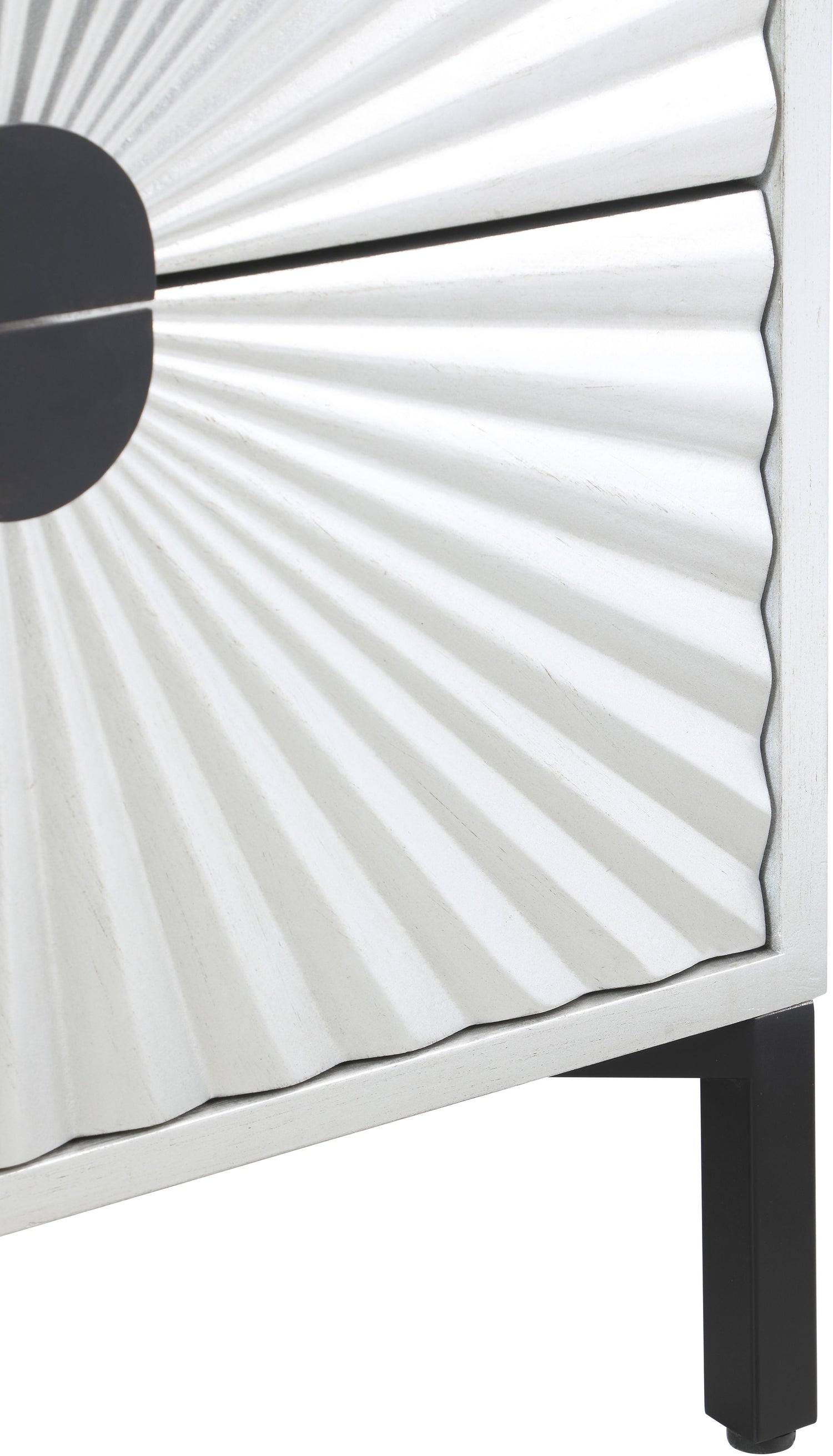 Bring on the glam with this pretty Glitz side table. This elegant table features a starburst design across the panels on its two drawers, making it an eye-catching element for your living room or bedroom space. The shared hardware on the drawers is matte black for a luxe look against the antique silver color palette. Add this attractive side table wherever creating a dramatic effect is the goal.