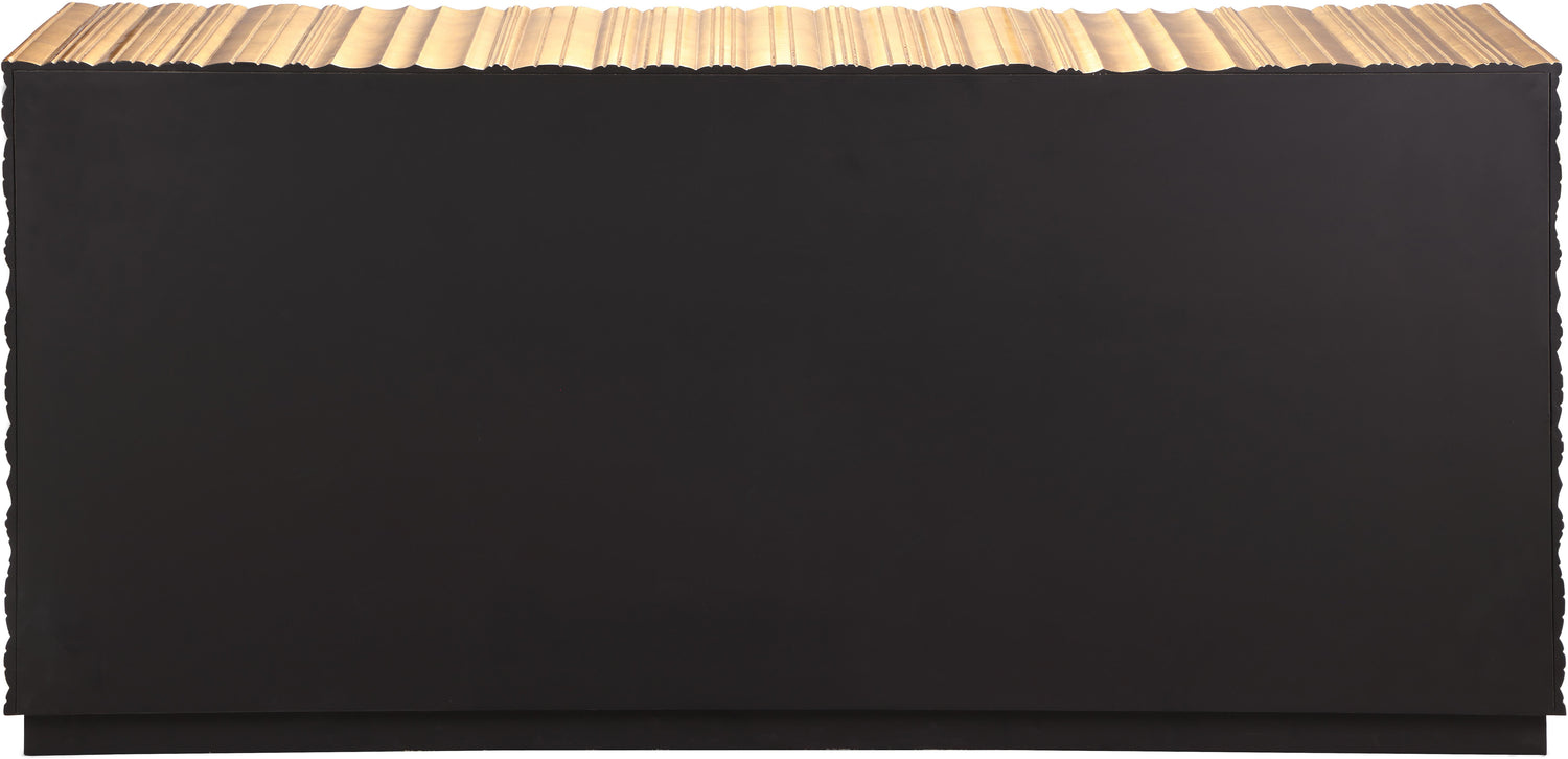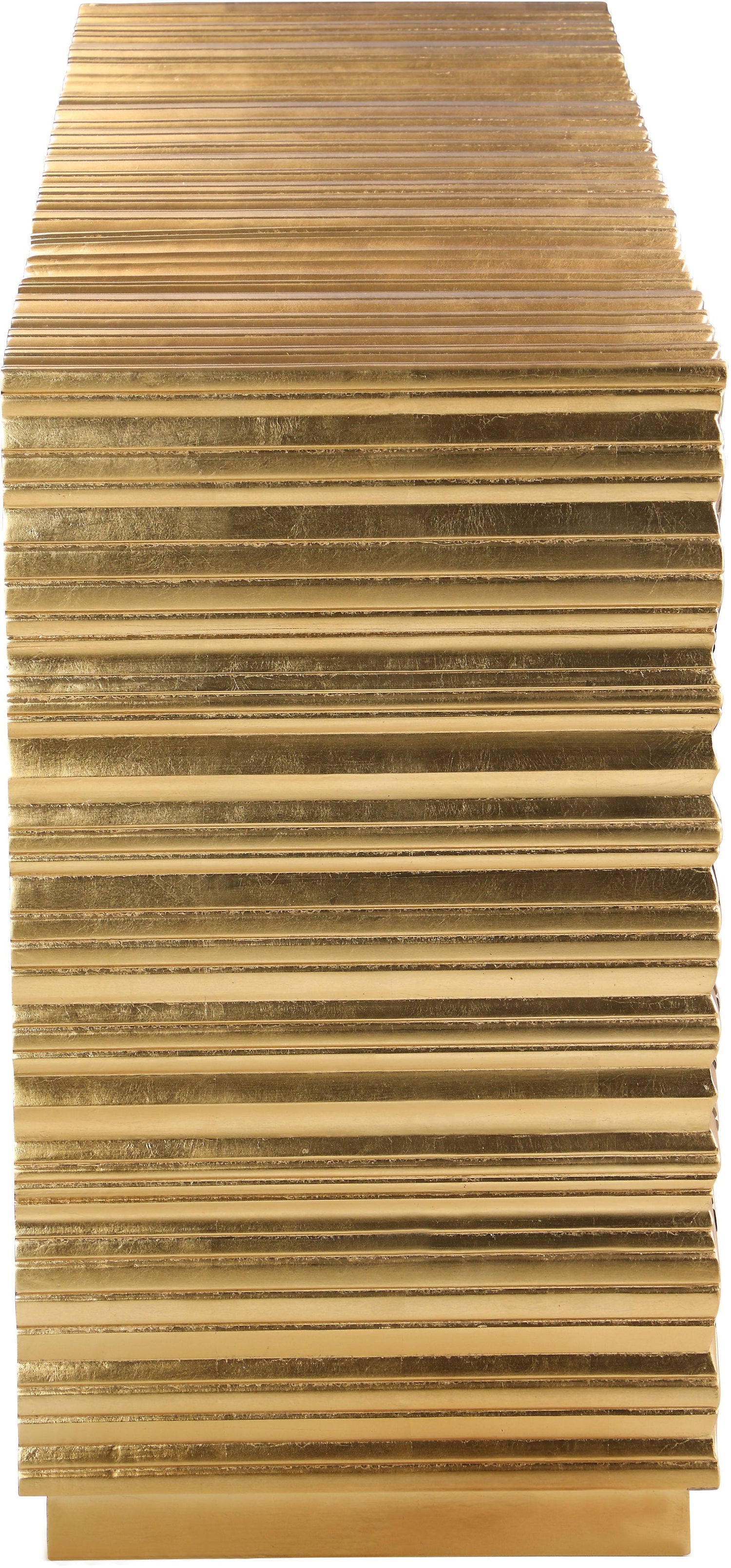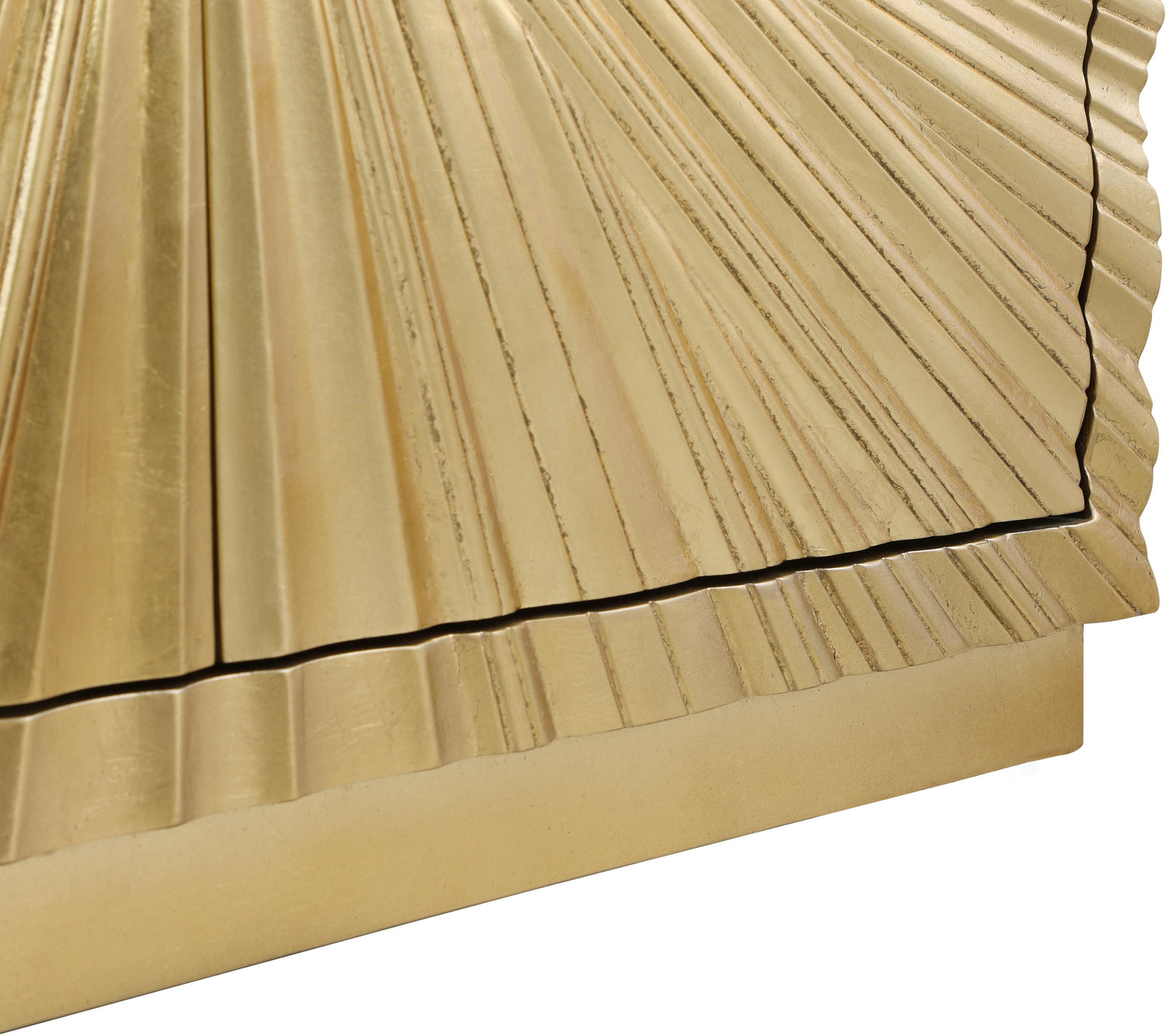 Bring home this Golda sideboard buffet to give your dining room an instant burst of style and glamour. The intricately hand-carved design features a starburst look that makes it a fitting addition to your contemporary space. The gold leaf finish is glamourous and glitzy, and when you open the doors to the unit,you'rell find ample storage space for holding everything from extra dishes and serving pieces to flatware and silverware.