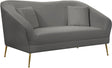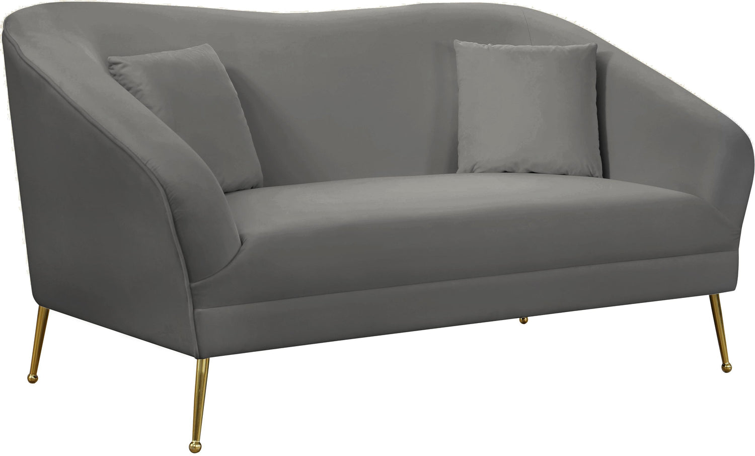 Create instant drama in your room with this Hermosa Velvet Loveseat by Meridian Furniture. The mid-century design makes the loveseat a true standout among other furnishings, with its sleek curved back and arms that create an aesthetically pleasing silhouette. The soft grey velvet upholstery feels sleek and sumptuous to the skin and gives your room an upscale look. Gold legs finish off the design, each of them with a ball design on the foot for added sophistication.
