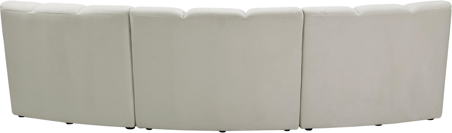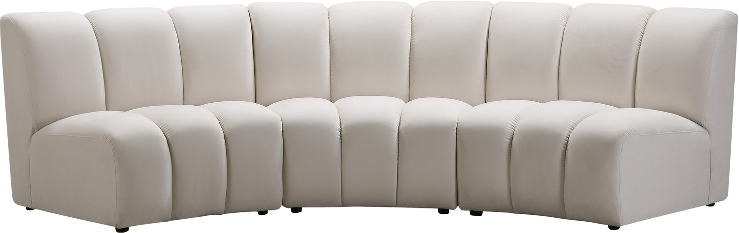 Create a seating group that works for every possible situation with this Infinity modular sofa and other pieces in the Infinity collection. Upholstered in soft cream velvet material that feels great against the skin and offers long-wearing beauty, this piece fits with other Infinity items for an infinite number of combinations that get your seating requirements just right but that look just as nice when used on their own.
