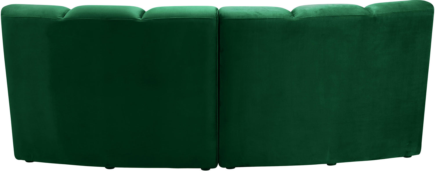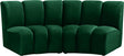 Create a seating group that works for every possible situation with this Infinity modular love seat and other pieces in the Infinity collection. Upholstered in soft green velvet material that feels great against the skin and offers long-wearing beauty, this piece fits with other Infinity items for an infinite number of combinations that get your seating requirements just right but that look just as nice when used on their own.
