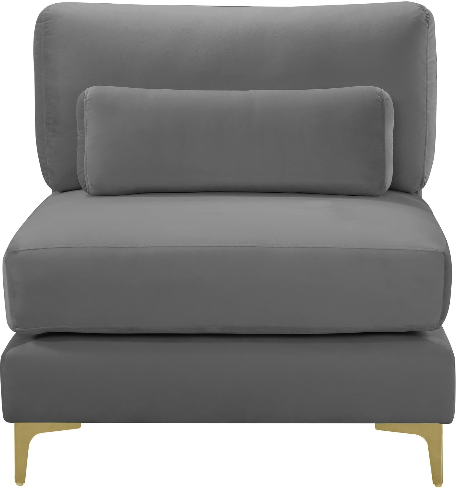 Ready to get cozy? Curl up from the welcoming confines of this Julia velvet modular armless chair and you can do just that! Its soft grey velvet upholstery is soft and supple to the skin, coaxing you to relax, unwind, and sit for a spell. It comes with both gold and chrome legs for a customizable and contemporary finish. Pair this Julia piece with others to form an infinite number of seating configurations to meet your particular decorative desires and space requirements.