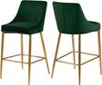 Yield to your contemporary side with this Karina Green Velvet Stool. This modern stool is counter height, making it an ideal addition to a home bar or eat-in kitchen counter. The green velvet upholstery brings a neutral element to your room, so it can easily meld with other furnishings. Plump seat and back cushions ensure that guests sit comfortably, whether they're enjoying a sudsy brew or a stack of pancakes. The polished gold metal frame is sturdy and stout, adding a durable slant to this lovely stool.