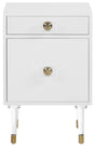 Put this handsome Lia Side Table to work for you in your modern decor. A sleek matte white finish lets it seamlessly blend in with other furnishings, while gold-trim and hardware adds a touch of upscale panache. The contemporary design sets your room apart as an up-to-the-minute spot to be, whether you use this Lia Side table in the bedroom as a nightstand or in the living room as an end table. A drawer on top holds essentials, and the door on the bottom swings open to reveal two open shelves for additional storage.