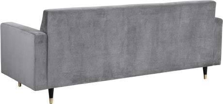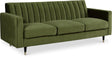 Cozy up to the comfort of this Lola Olive Green Velvet Sofa. Its rich color adds a jolt of excitement and fun to your space, shaking things up in a neutral-colored room. The back is channel tufted for a beautiful, contemporary look and to help the back cushioning maintain its welcoming loft. Elegant slant-tipped black legs with gold tips lend this sofa a charmingly modern finish and provide a sturdy foundation. Add it on its own, or add the matching loveseat and chair for a coordinated look.