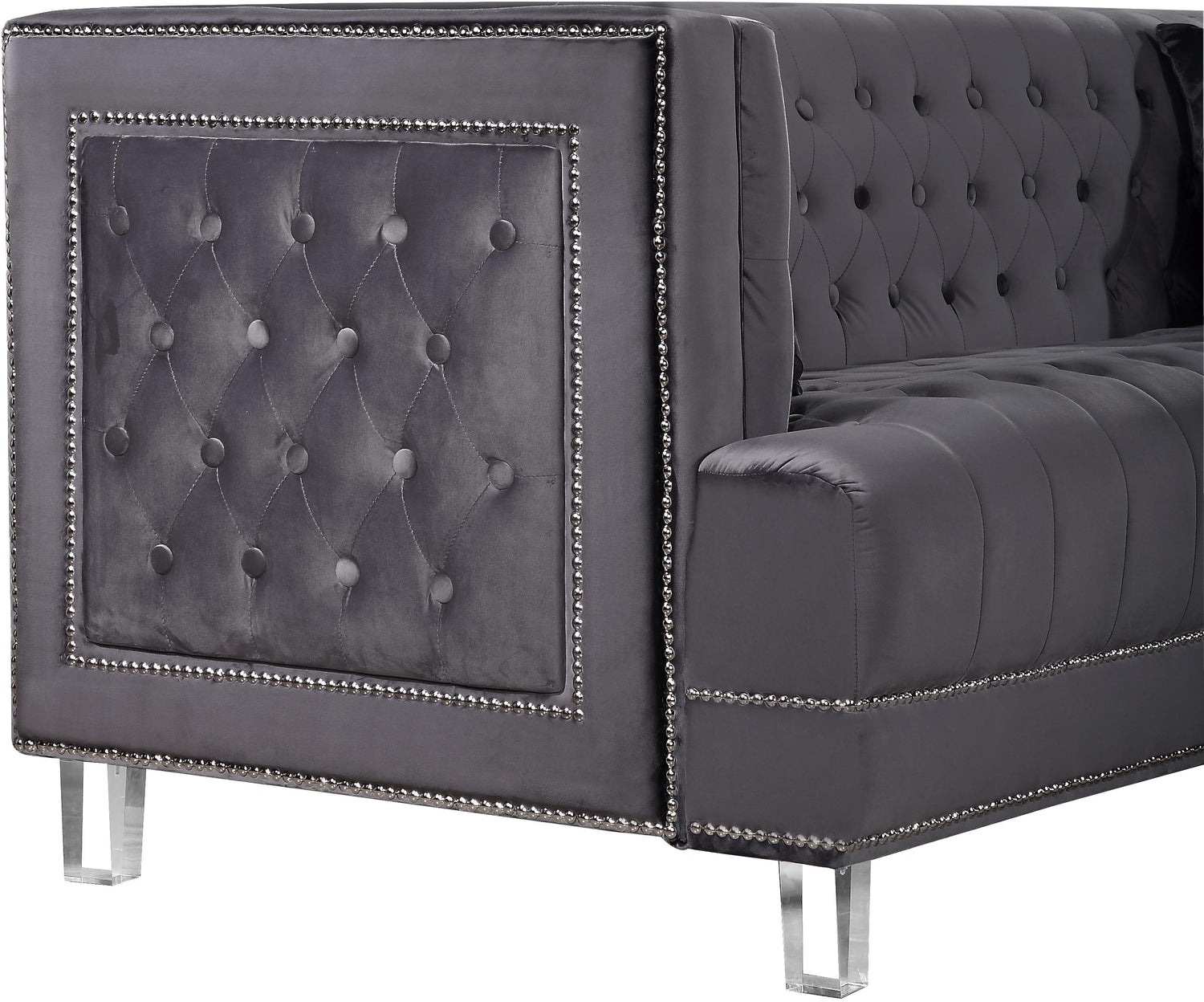 The Lucas Collection by Meridian Furniture. Features beautifully tufted velvet upholstery with a custom nail head design and clear acrylic legs. This collection is guaranteed to be the highlight of any home.
