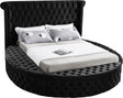 Marvel at the remarkable beauty and graceful lines of this round Luxus black velvet king size bed. The headboard, footboard and side rails are all adorned with deep button tufting, and there is nailhead trim on both sides of the tall headboard. The footboard and side rails all contain ample storage and seating, making it easy to sit down in comfort so you can put on your pants or shoes.