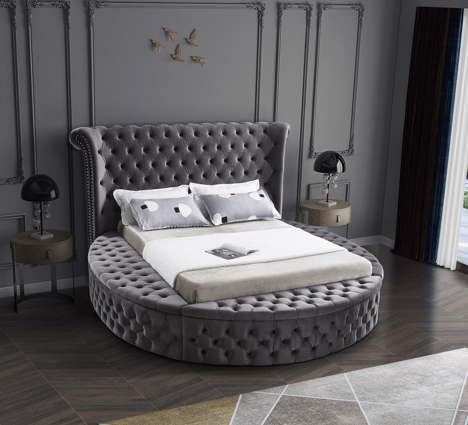 Marvel at the remarkable beauty and graceful lines of this round Luxus grey velvet king size bed. The headboard, footboard and side rails are all adorned with deep button tufting, and there is nailhead trim on both sides of the tall headboard. The footboard and side rails all contain ample storage and seating, making it easy to sit down in comfort so you can put on your pants or shoes.