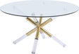 Bring modern pizzazz to your living room with this Mercury Acrylic Gold Coffee Table by Meridian Furniture. The base features a pedestal design with acrylic gold legs for a touch of contemporary fun. The tempered glass top offers plenty of room for holding items like framed pictures or magazines. The top is clear, so you can easily see the beauty of the metallic legs showing through, giving your living room or den a little something extra.
