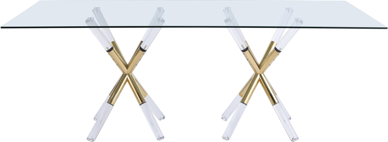 Bring modern pizzazz to your living room with this Mercury Acrylic Gold Dining Table by Meridian Furniture. The base features a pedestal design with acrylic gold legs for a touch of contemporary fun. The tempered glass top offers plenty of room for seating guests for intimate meals together. The top is clear, so you can easily see the beauty of the metallic legs showing through, giving your living room or den a little something extra.