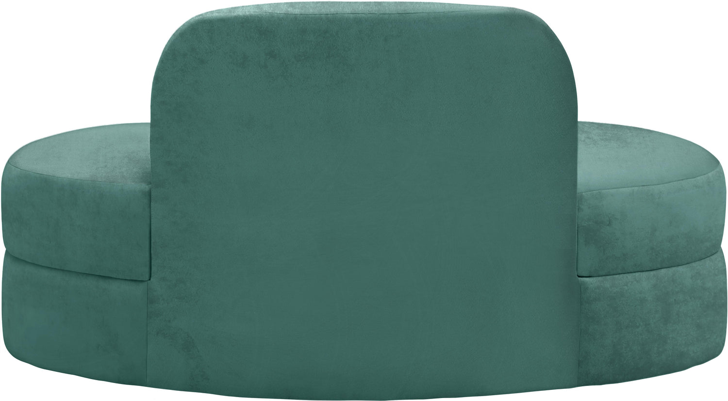 Relax and unwind from the soft comforting confines of this Mitzy velvet love seat. This elegantly eye-catching chair has a lot to offer with its uber contemporary design and its soft mint velvet. Its unique kidney-shaped design lends it to modern d?�cor themes with ease, and the upholstered base provides sturdy support for you as you sit and destress in front of the TV.