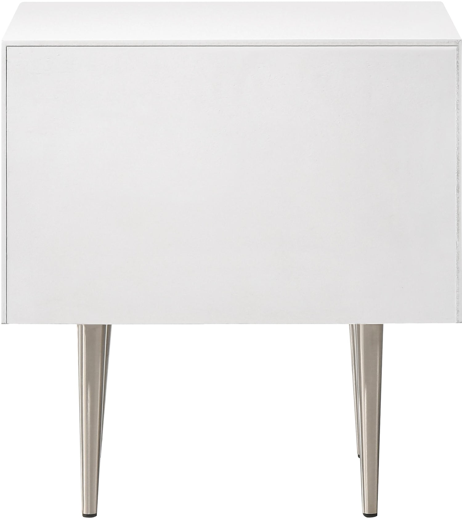 Embody industrialist style with this Modernist night stand in a white medium gloss finish. Utilitarian but sculptural in design, this piece features a ridged, textured look that is chic but sleek. It rests on brushed gold steel legs and has gold brushed handles for a bit of regality. Combine this piece with other items in the Modernist lineup for a cohesive finish to your room makeover.