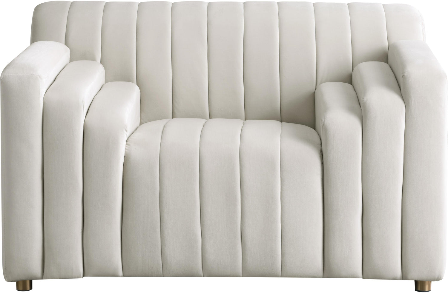Express your bold, contemporary side with this Naya velvet chair. This handsome piece is upholstered in cream velvet and blends seamlessly with the other units in the Naya collection, or it looks equally as beautiful on its own. Deep channel tufts run the length of the back, arms and seats of this unit, ensuring its exceptional comfort while giving it a decidedly modern vibe.