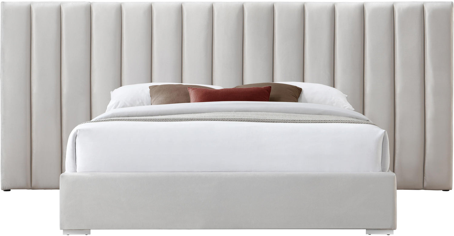 Sleep like royalty in this Pablo queen size velvet bed. This beautiful bed is destined to become the centerpiece of your bedroom sanctuary makeover with its elegantly eye-catching design and soft cream velvet upholstery. The bed rests on sturdy metal feet with a gleaming chrome finish, helping to ensure its strength and resilience for long-term use. Pair it with other items in the Pablo collection for a cohesive and coordinated look.a