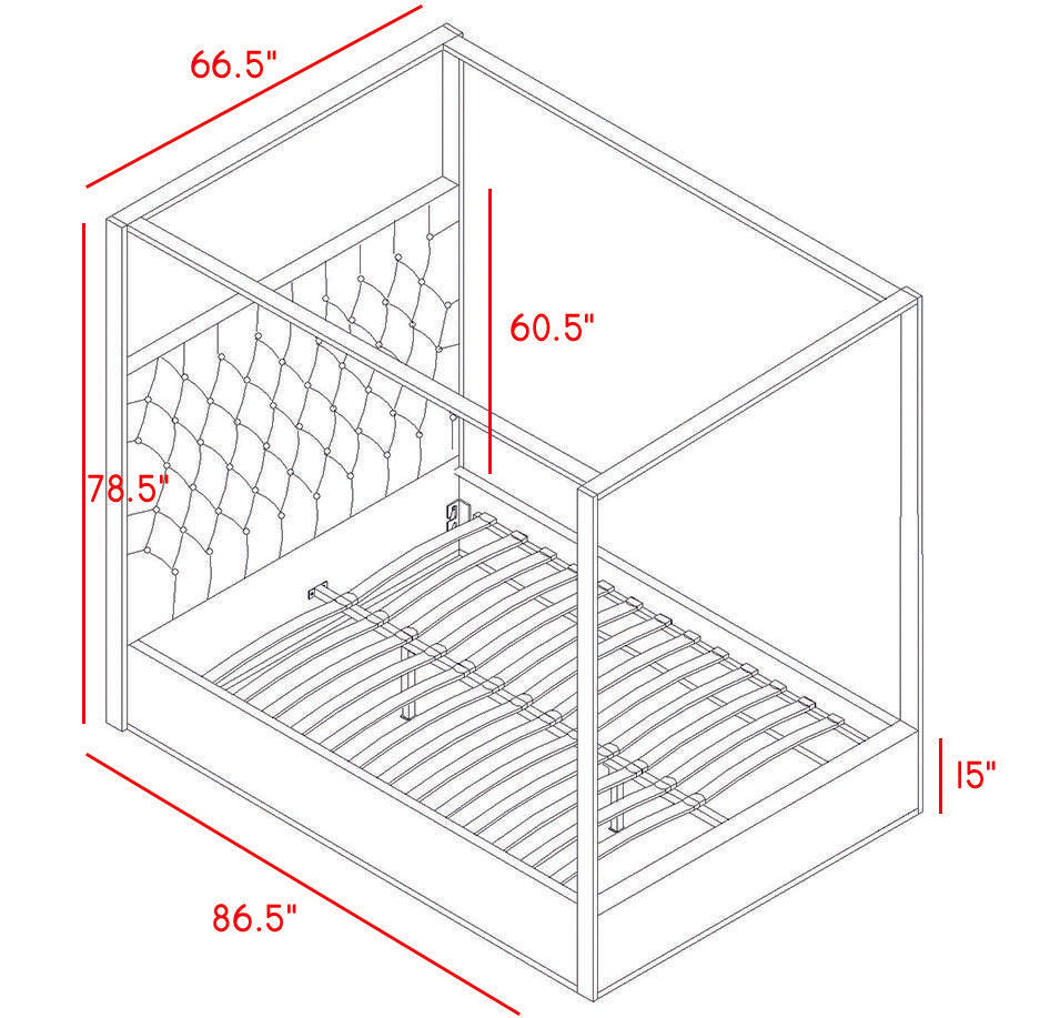 Dream big in the Porter black velvet canopy bed. This handsome Meridian Furniture bed has a tufted headboard that stands a full 60 inches tall, giving the bed a regal and sophisticated look. The headboard is tufted for added elegance, and the bed comes with a chrome canopy, adding to its overall elegance and grandeur. Black velvet fabric used on the sides and headboard gives it a luxe vibe, and the headboard is heavily padded, making it an ideal backrest for reading or watching TV.