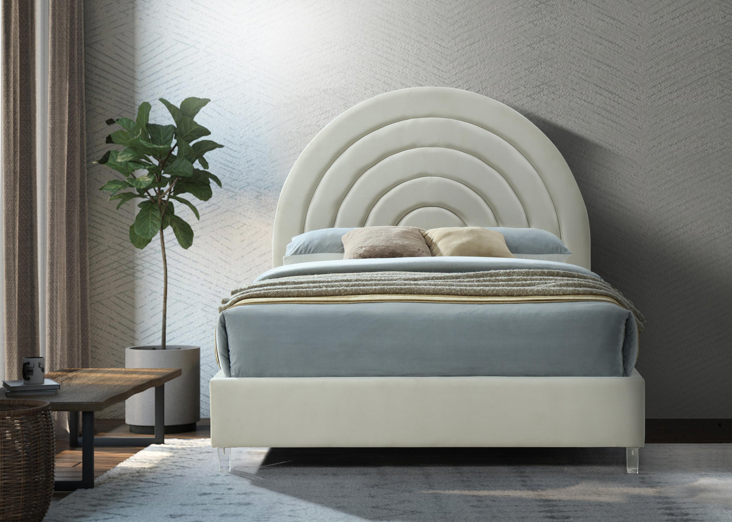 There���s a lot to fall in love with when it comes to this Rainbow full-size velvet bed. This stunning bed is fit for an MVP with its rich cream velvet upholstery covering the headboard, side rails and foot board. This bed rests on thick white acrylic legs for added support and features deep channeled tufting on the headboard for a textural look that���s dramatic and elegant all at once.