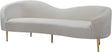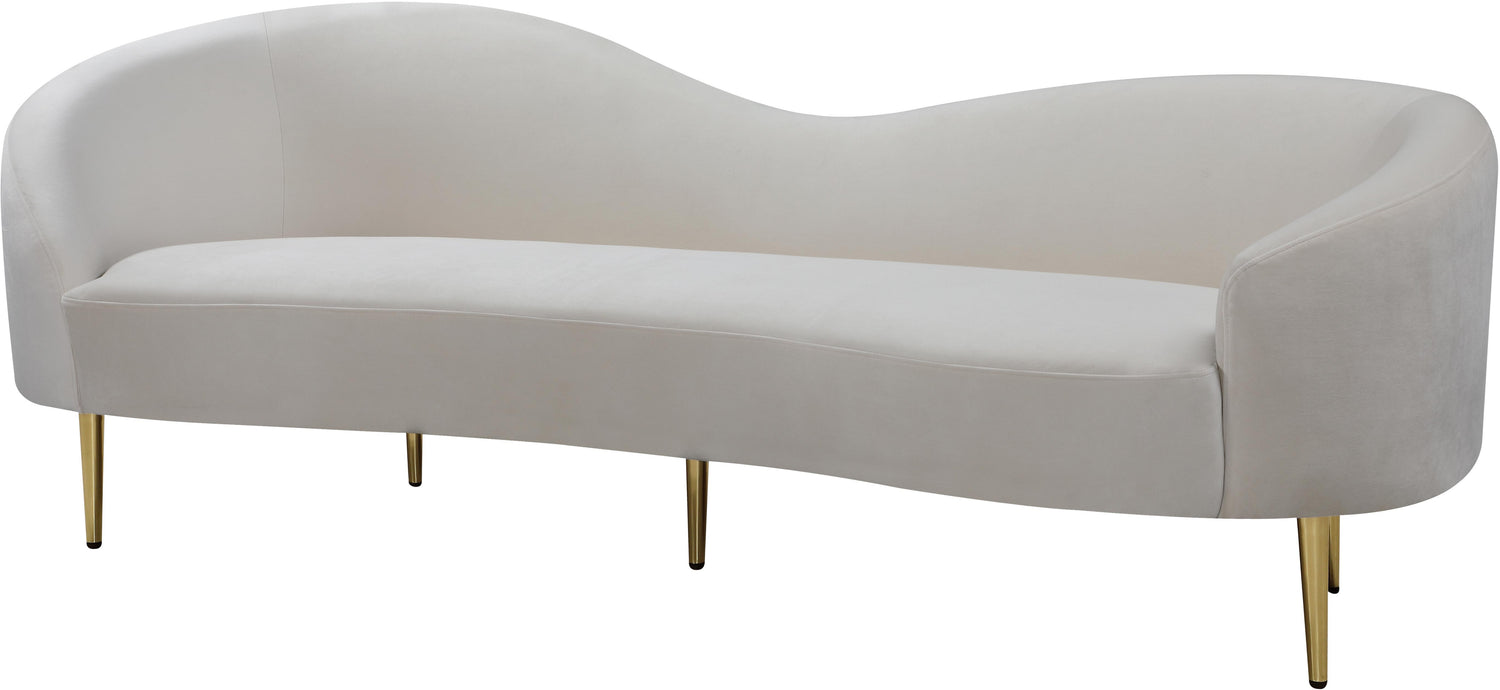 Get comfy while remaining chic in this elegant Ritz cream velvet sofa. Plush cream-colored upholstery provides a soft texture that is pleasing to the senses, while its curved design offers a contemporary touch to your home furnishing. Gold metal legs complement the sofa's sophisticated cream color, creating a gallant piece anyone would be proud to display in their home.
