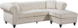 Lounge in luxurious style and comfort with this sleek Sabrina cream velvet reversible two-piece sectional. Featuring elegant, plush velvet upholstery and a deep tufted back, this sectional is a little piece of heaven for you to kick back and relax on. Double row chrome nailheads give the sectional a contemporary element, and a reversible chaise offers a comfortable place to kick up your feet after a long day. Pillows are included as well to add to your comfort.