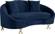 Give your living space a bold touch with this Serpentine navy velvet loveseat. This roomy chair features lush navy velvet upholstery that offers a soft, comfy place to rest that is pleasing to your senses, while its rounded, contemporary design mixes style and comfort. Gold steel legs complement the loveseat's navy color, giving it an elegant touch that?��Ǩ�Ѣs perfect for your chic home decor. Place this loveseat in a corner or next to an end table for additional seating options in your living room or den.