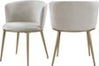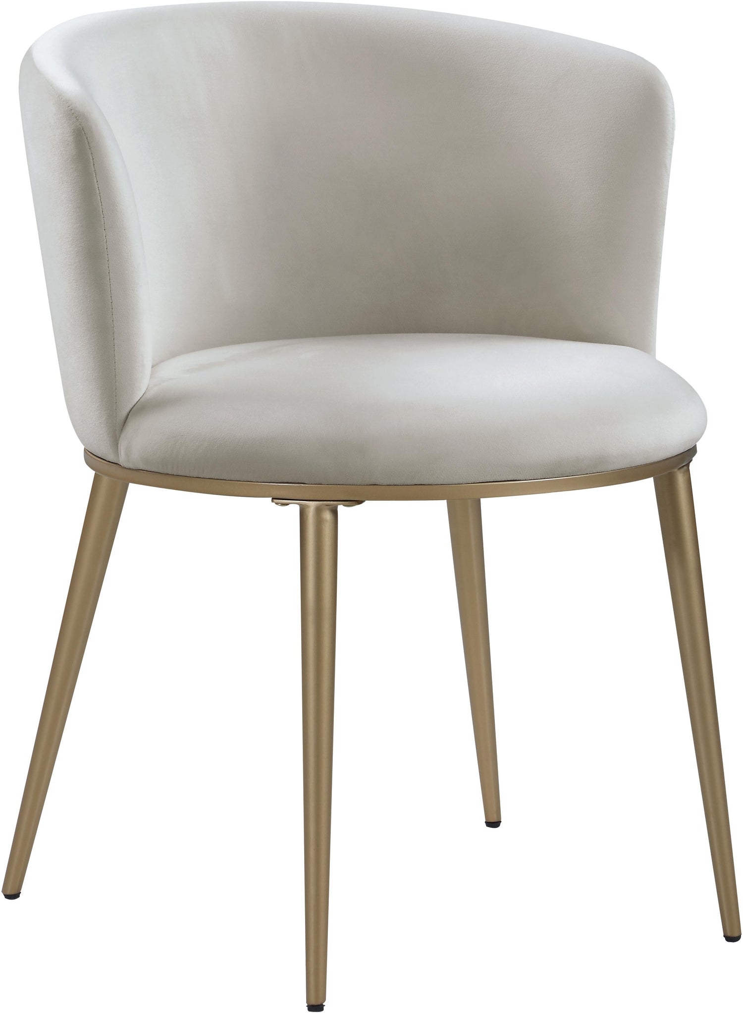 Enhance your d?�cor with the Skylar cream velvet dining chair, due to its petite silhouette and artistic style. A soft round cushion and gently curving cushioned back give this chair an ageless quality that belies its contemporary design. A brushed gold base is supported by four tapering gold legs, and it weighs only 11 pounds overall. Easily paired with any of several available tables, this chair is equally well-suited to use in a conversation grouping.