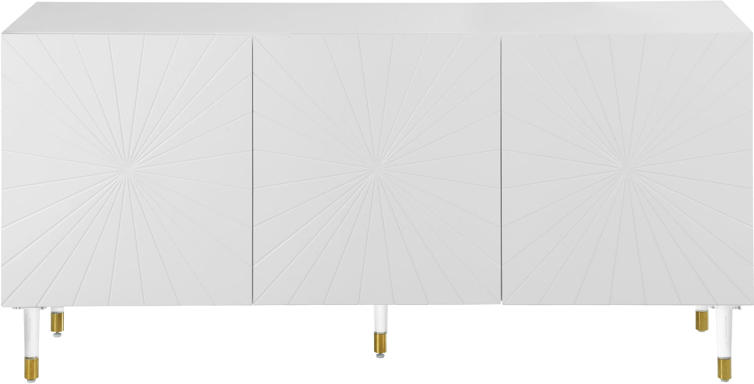 Make a bold statement in your living space with this eye-catching Florence Sideboard/Buffet from Meridian Furniture. Its white lacquer is complemented by a gold finished base, creating a contemporary design that's both modern and stylish. Four side cabinet doors open up to reveal four cubby spaces, giving you ample room to safely tuck away dishes, pots and pans, knick-knacks, books, or other household items, while the top of the sideboard/buffet doubles as shelf space for items you want on display.