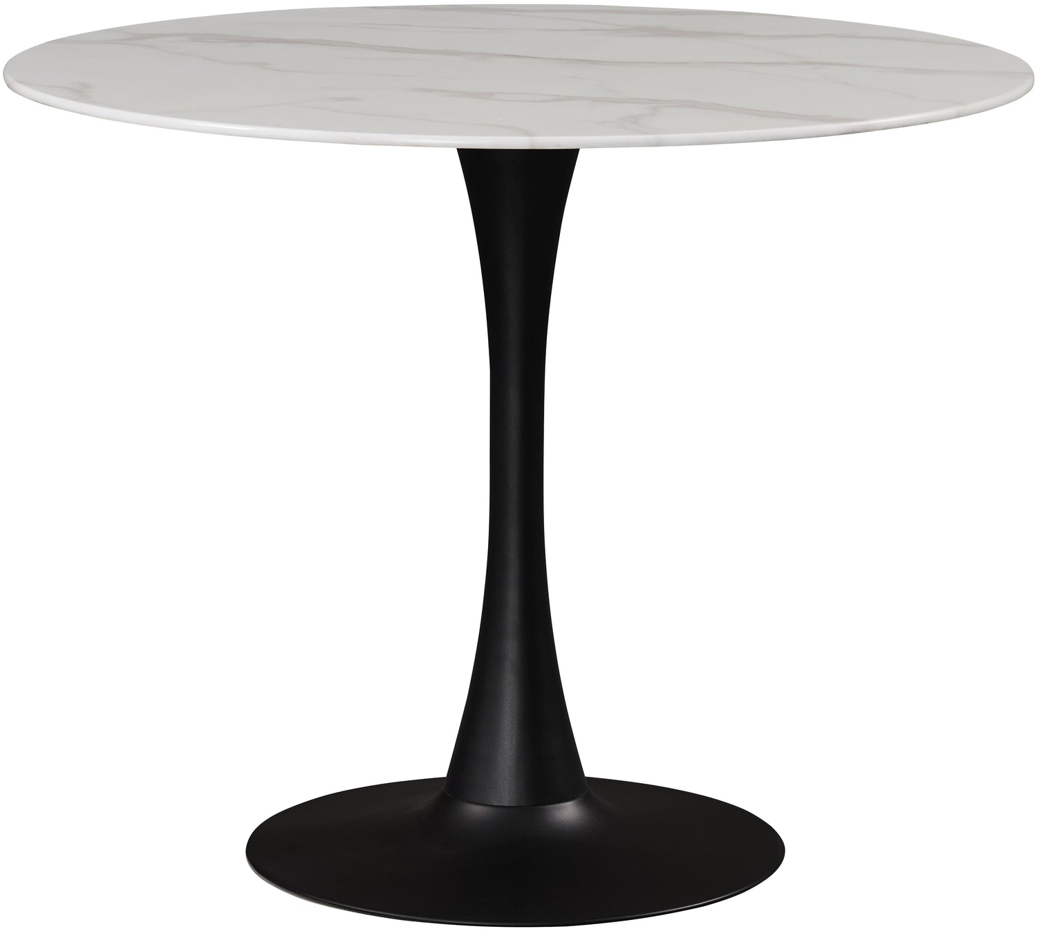 Add the Tulip 36" dining table to your kitchen, den or office to enjoy its petite size and elegant lines. The tabletop is made of 10MM thick glass with a glamorous marble veneer. A rich matte black pedestal base adds to the appeal of this gorgeous piece, and lets it fit into smaller spaces comfortably. Choose from a wide array of available matching chair styles to complete your contemporary style d?�cor.