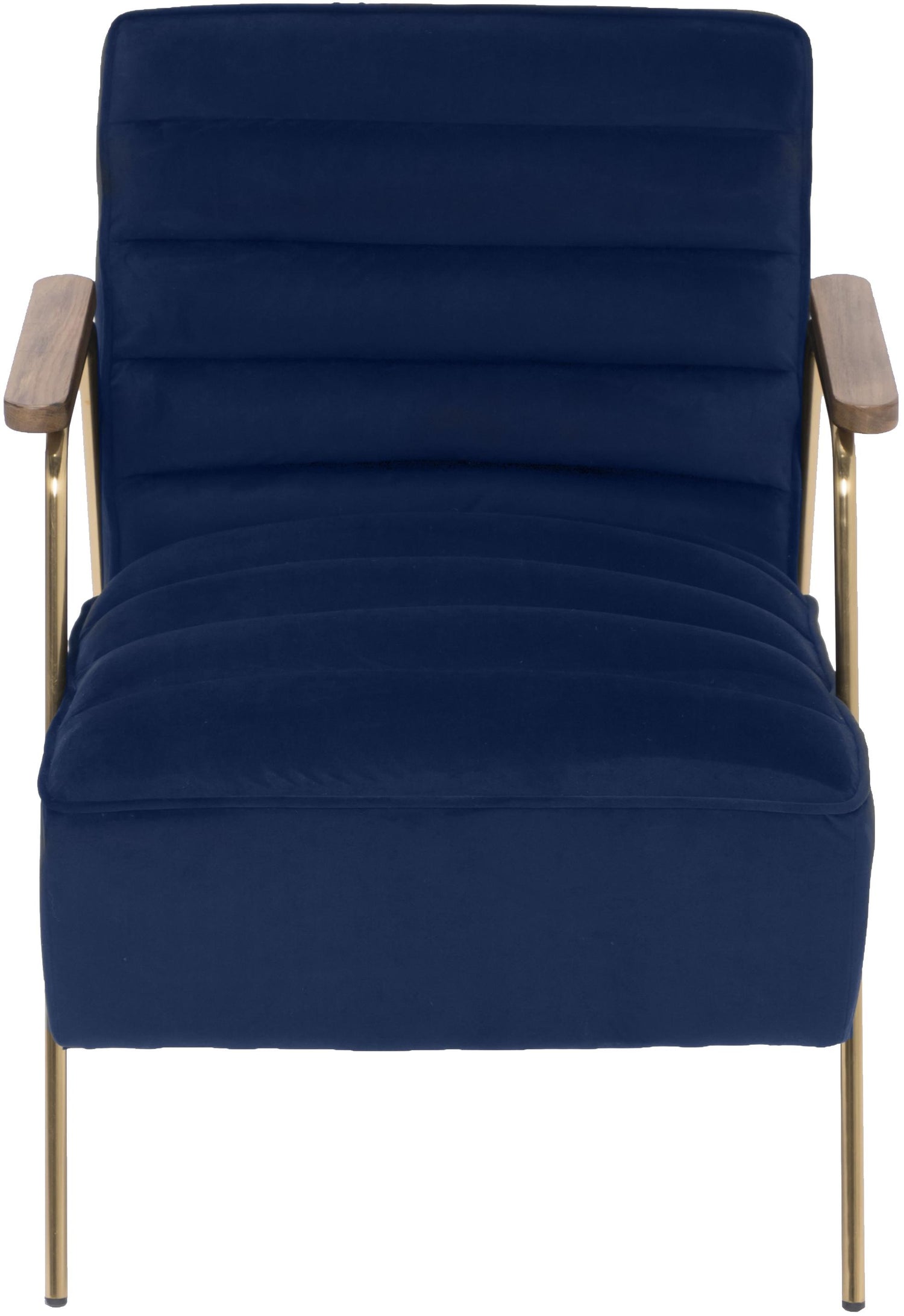 Go mod in your living room, den or other space with this Woodford velvet accent chair. This lovely addition to your home features soft navy velvet upholstery for a lavish look in any room. The back and seat are channel tufted for added resilience and lasting beauty. The metal frame adds enduring quality to this chair, and the brushed gold metal legs and wood arms lend it a definitive contemporary vibe.